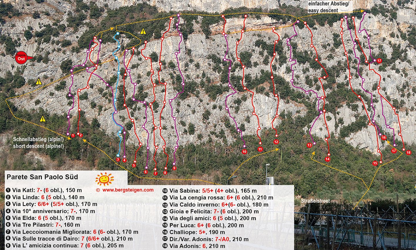 Mit der Via Elda haben die Erstbegeher einen Anstieg durch das Buschwerk gesucht bzw. ausgegraben. Von Italienern im Jahr 2013 erstbegangen, dann vom Team um Grill/Kluckner verbessert, abgesichert und vor allem noch einmal gründlich mit dem Kärcher gesäubert. Entstanden ist eine nette Kurzroute, welche sich - da direkt am Abstiegsweg gelegen - sehr gut als Zweitroute in der Südlichen San Paolo-Wand eignet.
