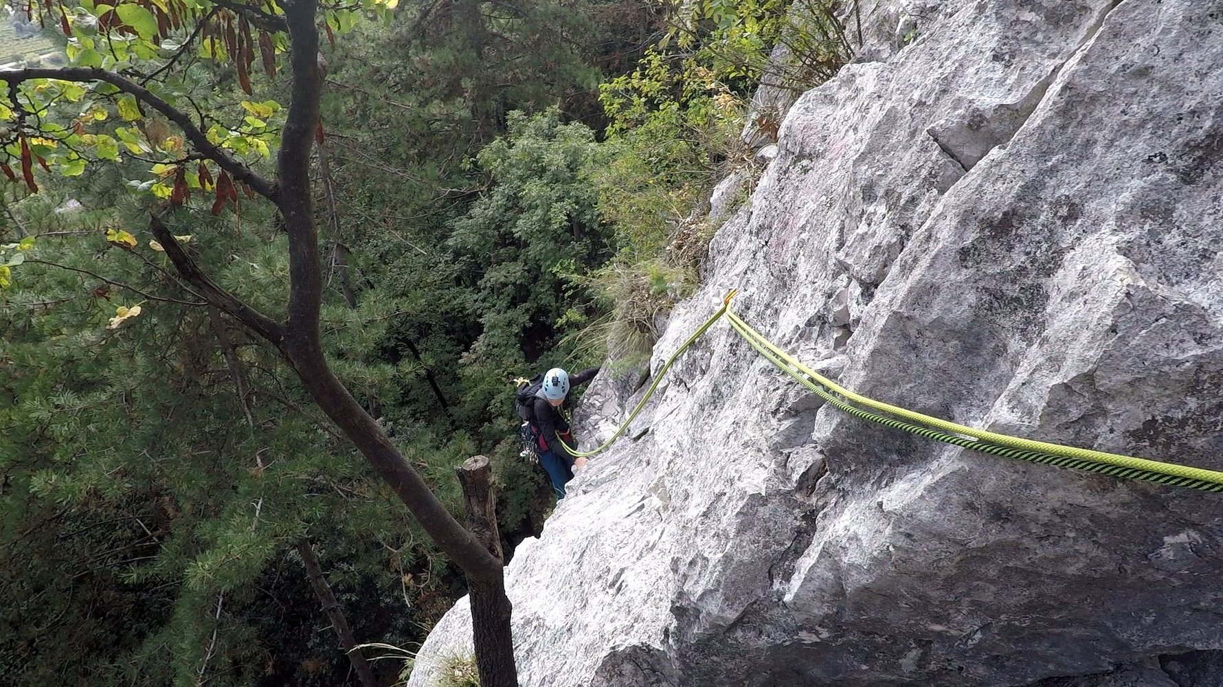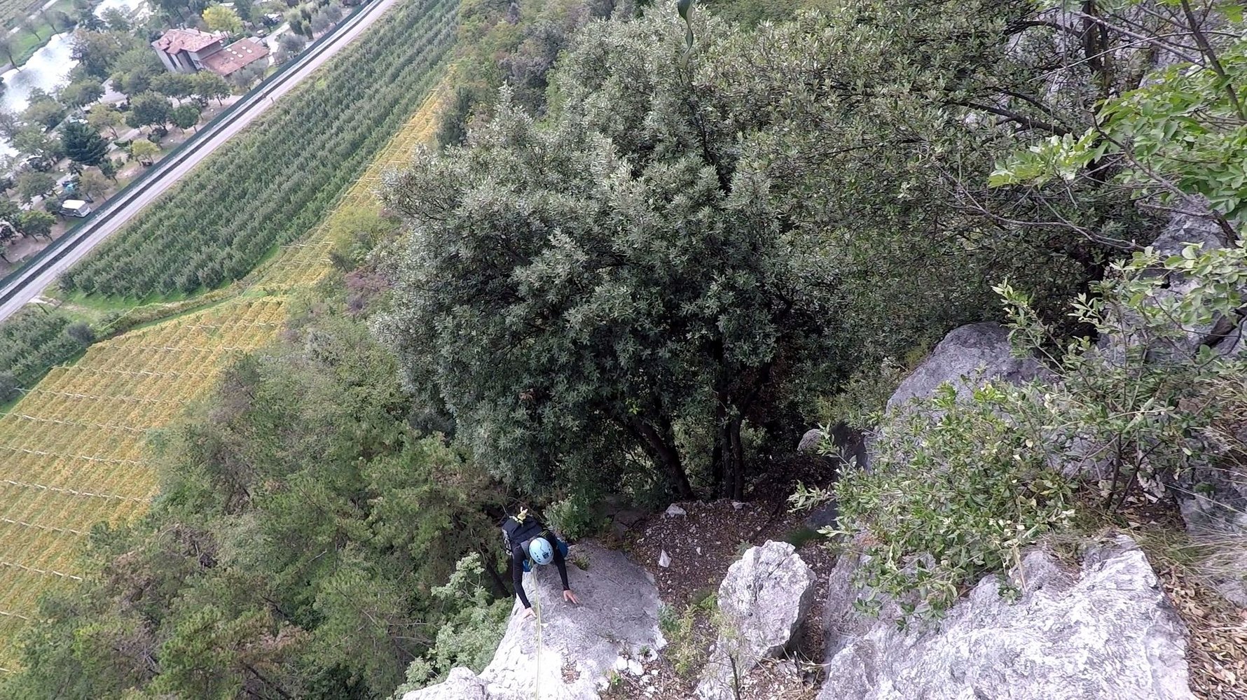 Zur Pizzeria und die Straße kurz zurück in Richtung Arco - ein Steiglein führt hinauf zum Klettergarten (mit einem markanten Doppelrissdach). Links auf dem breiten Pfad der Wand entlang, dort wo der Pfad etwas ansteigt kommt man direkt am Einstieg vorbei. Die Route ist angeschrieben. Die Route verläuft im linken Wandteil der Parete San Paolo.