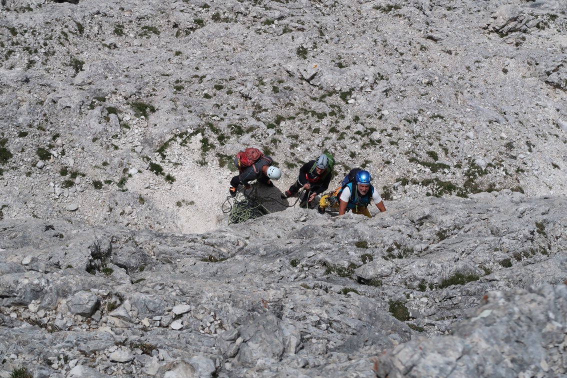 Ohne Abseilen (ca. 30 Min. Mehraufwand): Vom Ausstieg links auf Pfadspuren absteigen bis man auf den Normalweg zur Corda Negra trifft (NICHT gerade hinunter!). Auf diesem hinunter in die Senke, dort rechts zum Wanderweg 419. Auf diesem über die Forc. Averau (2435 m) auf die Südseite und zum Rif. Averau (Bergstation Sessellift). Von dort auf dem Wanderweg hinunter zur Talstation beim Rif. Fedare (Parkplatz).