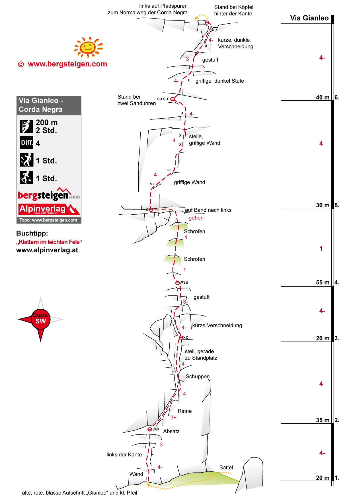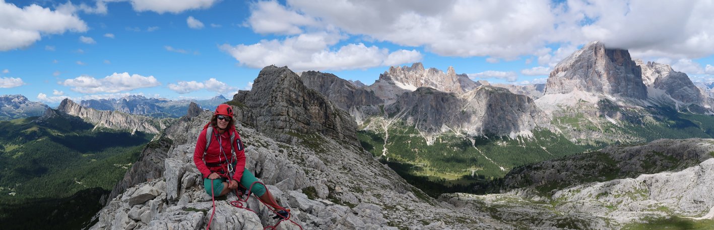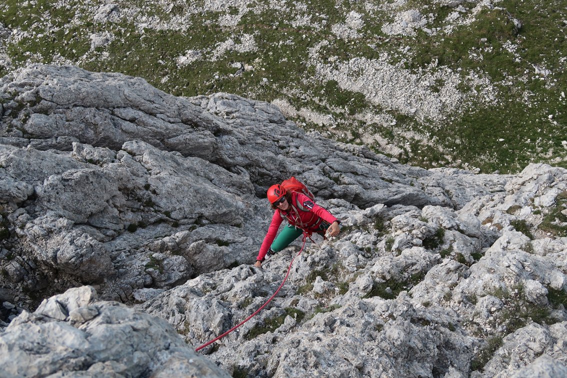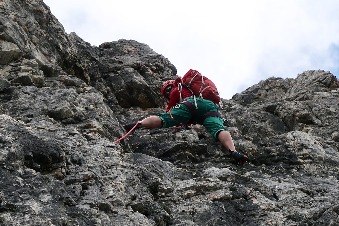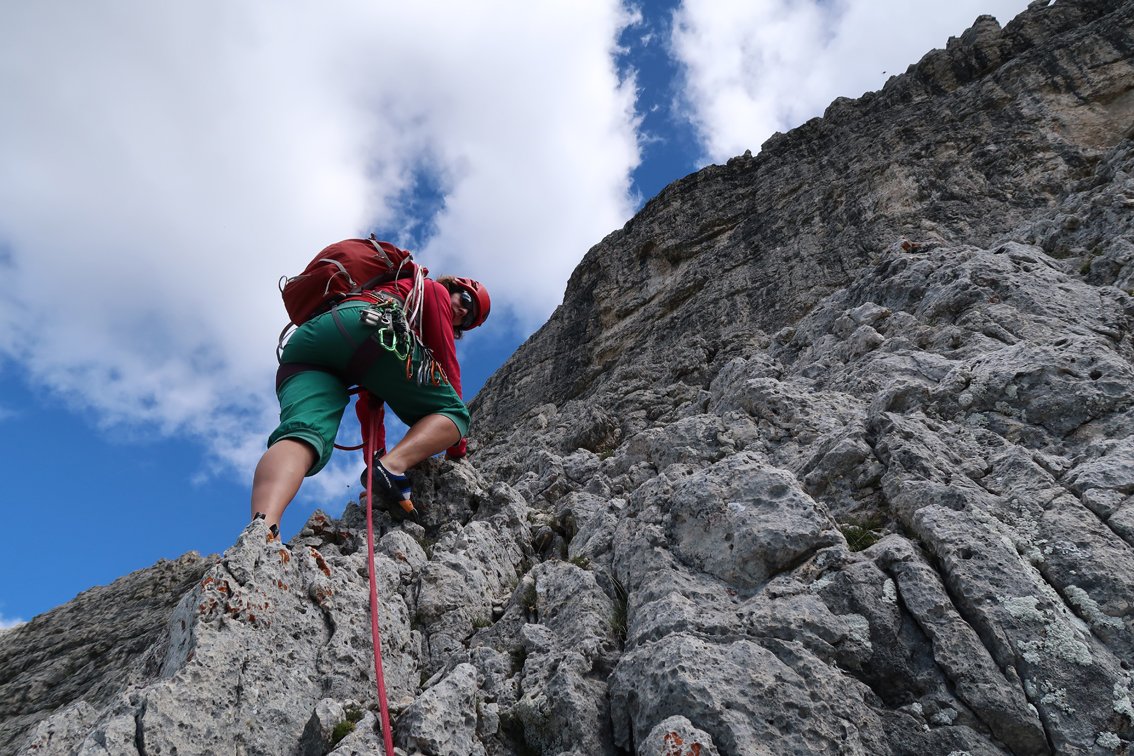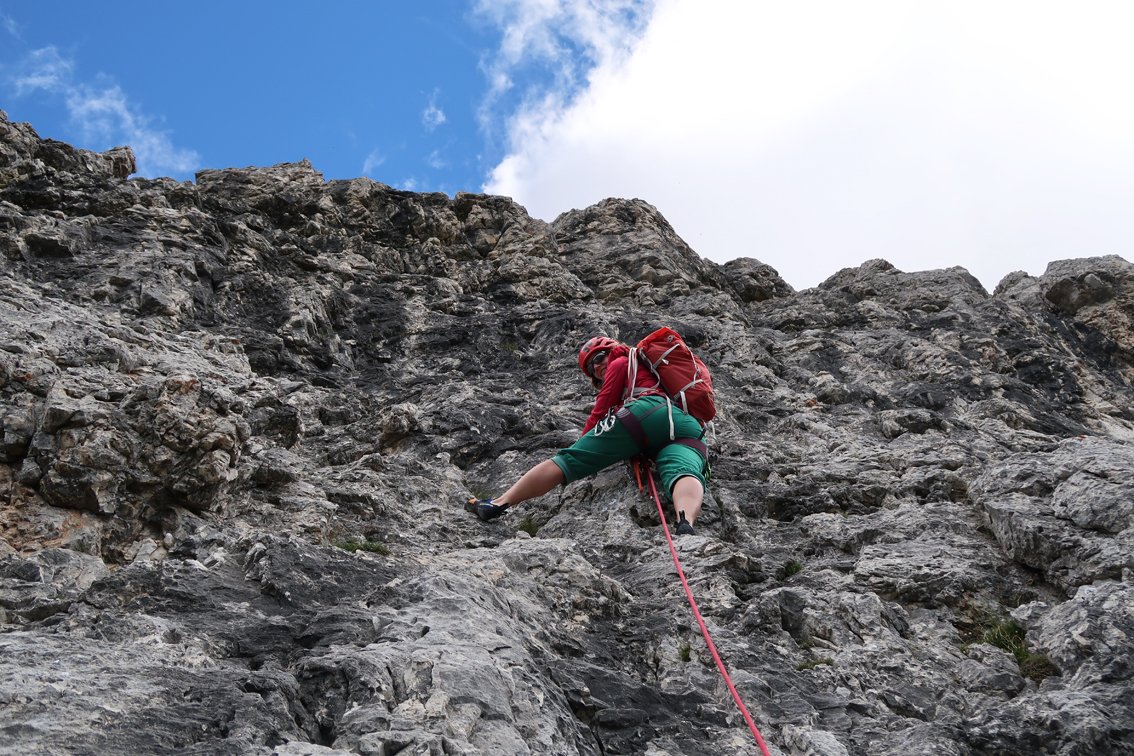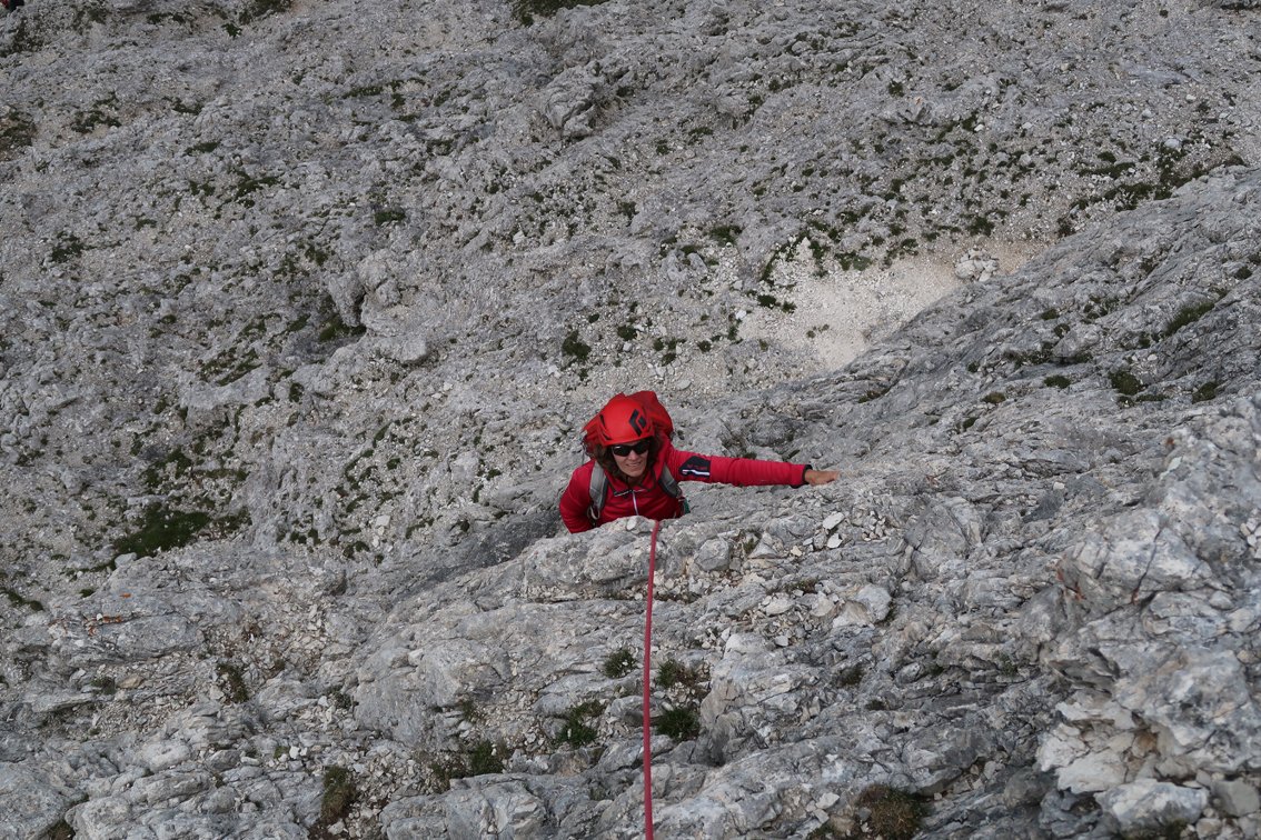 Der Genuss-Klassiker an der Südwestwand der Croda Negra. Die beliebte Route zieht gerade durch die griffige Kalksteinwand hinauf zum Gipfelgrat. Die Kletterei ist nie richtig ausgesetzt, unten kann man sehr gut mit Schlingen und Keilen absichern, im oberen Teil stecken ein paar Bohrhaken. Wer will kann noch den Gipfel der Croda Negra besteigen - ca. 15 Min. Mehraufwand.