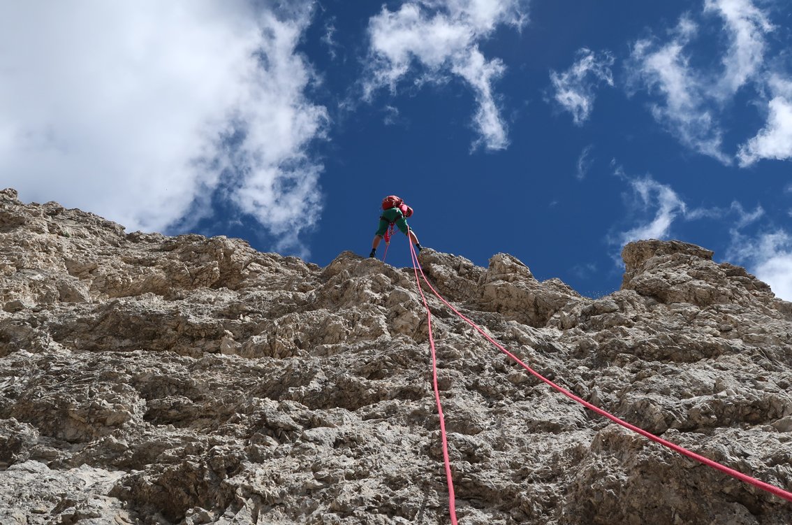 Vom Ausstieg links auf Pfadspuren absteigen bis man auf den Normalweg zur Corda Negra trifft (NICHT gerade hinunter!). Auf diesem dann nach rechts in die erste markante Scharte. Etwas unterhalb der Kante ist eine Abseilstelle. Dort 2 x 25 m abseilen, in der Rinne absteigen und zurück zum Zustiegsweg und weiter zum Parkplatz.