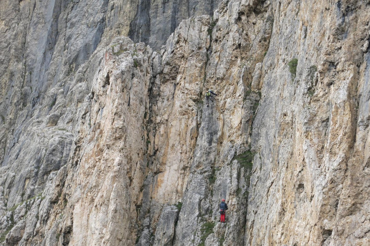 Am Gamsband auf dem deutlichen Weg auf- und absteigend nach links (Westen). Drahtseilgesichert eine Schlucht queren, durch ein Loch und weiter bis kurz nach dem Eck, wo man das erste Mal die vielen Abstiegsspuren sieht. Hier einen kurzen Kamin abklettern (2+, gute Griffe am orografisch rechten Rand) oder abseilen an der Sanduhrschlinge. Rechts haltend absteigen, zuletzt abklettern (2+) bzww. wieder Abseilen. Man kann auch vom Gamsband über die Abseilpiste des 'Bergführerweges'; 4 x abseilen. (ca. 10 min. entlang des Gamsbandes Richtung Sellapass; wobei man des ersten Abseilstand finden muss.