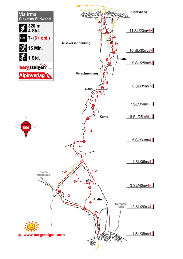 Siehe Topo. Die Route endet am Gamsband in halber Berghöhe.