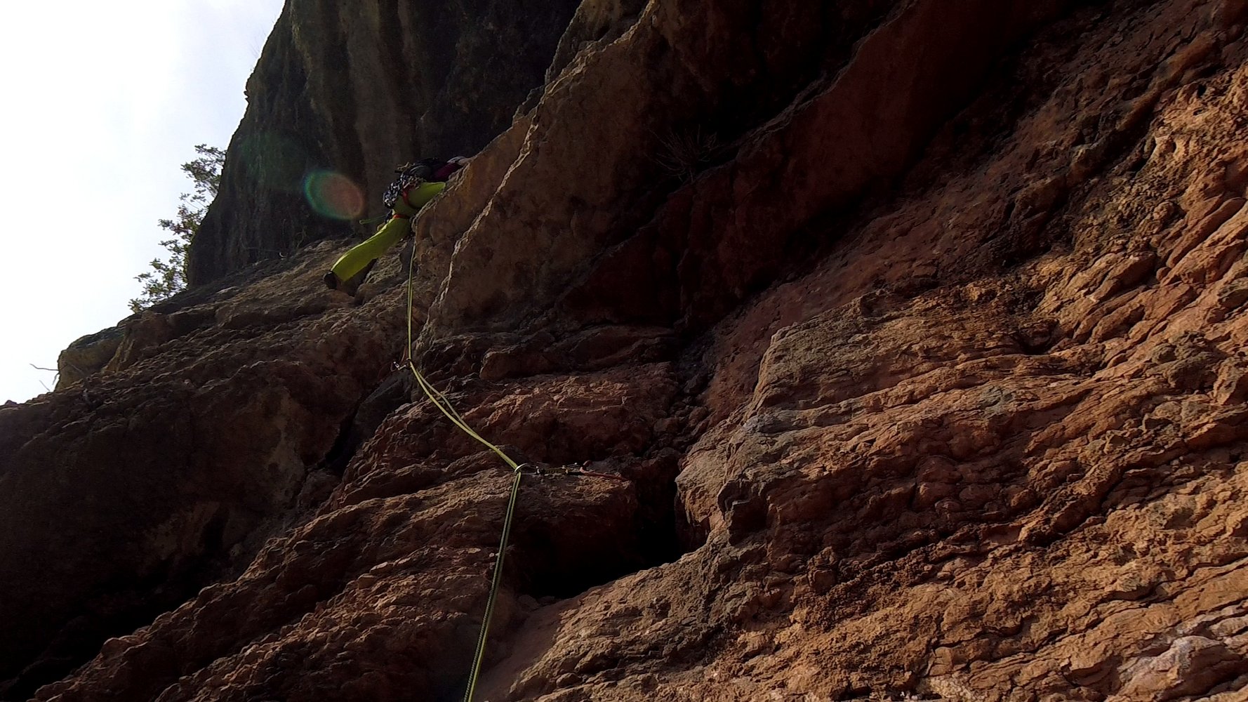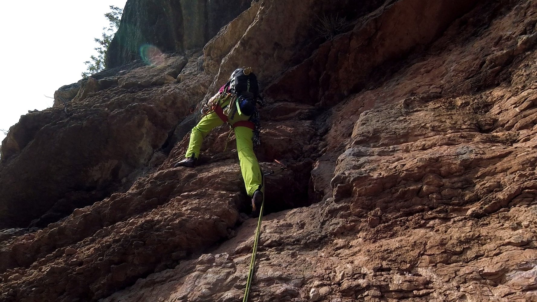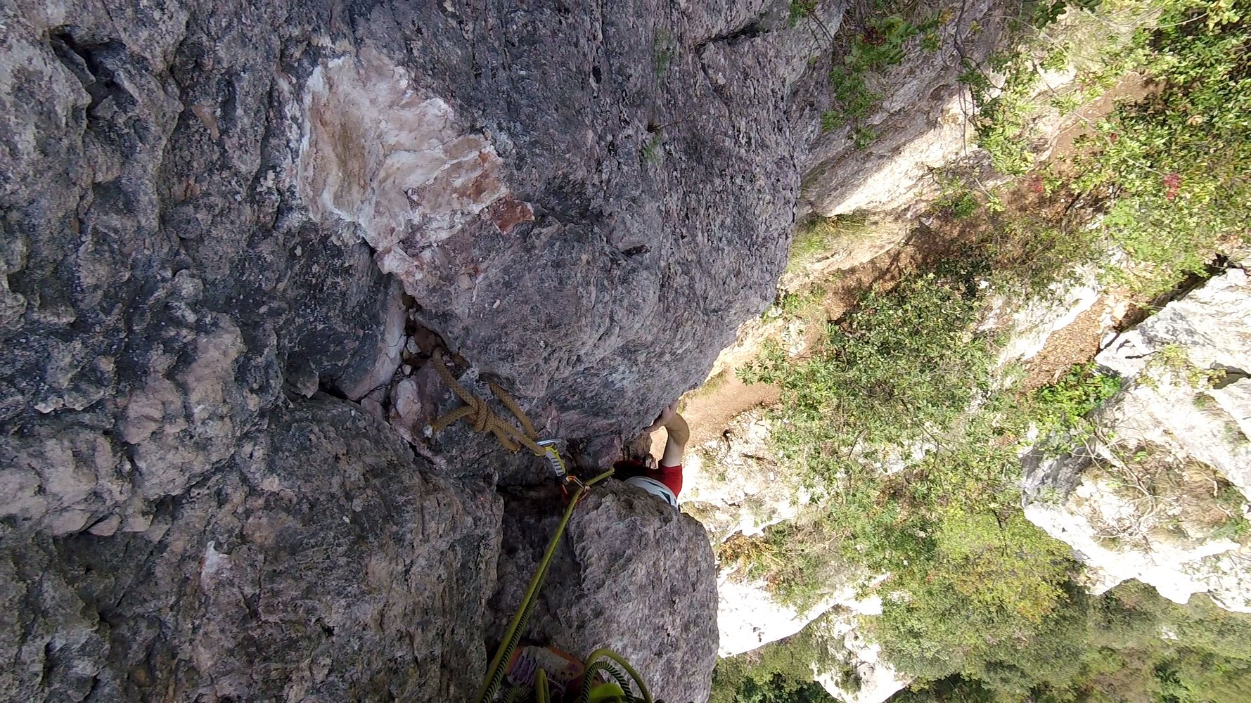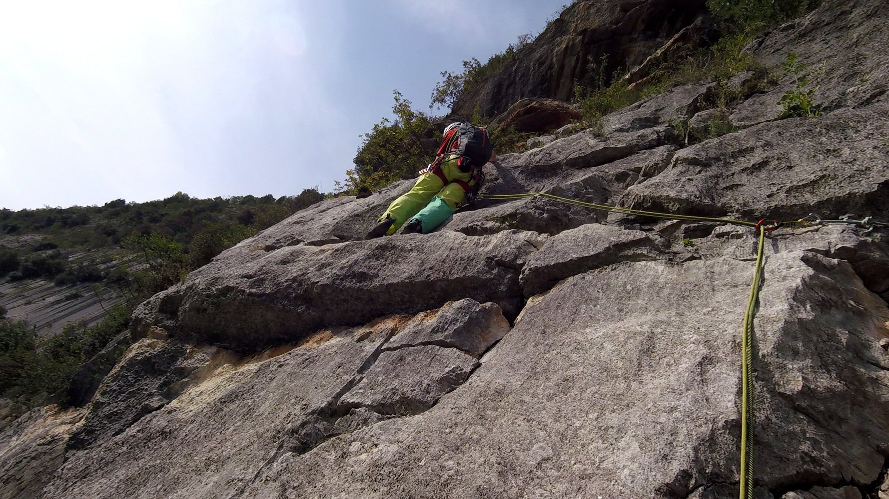 Die Absicherung ist gesamt als gut zu bezeichnen (es gibt einige Bohrhaken und Sanduhrschlingen). In den leichten Passagen etwas weitere Abstände, in der vierten Seillänge sollte man einen Friend 0,5 einsetzen.