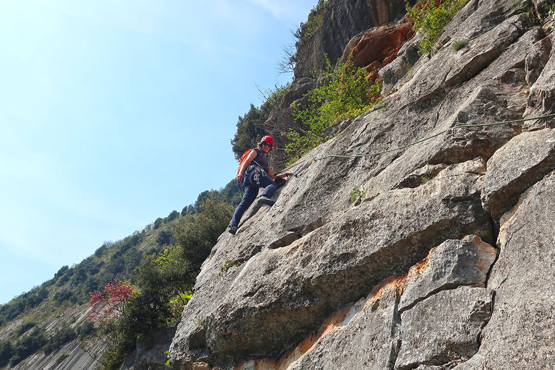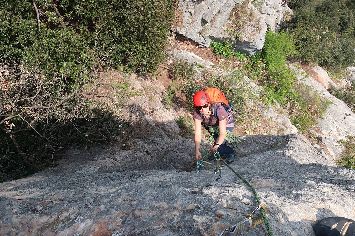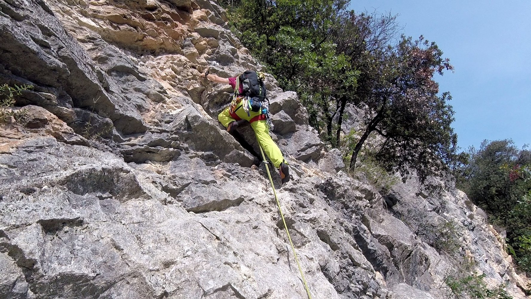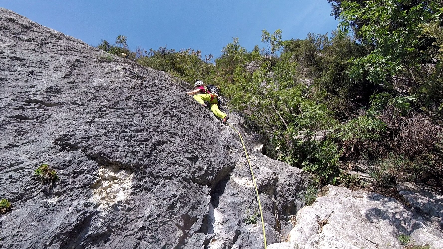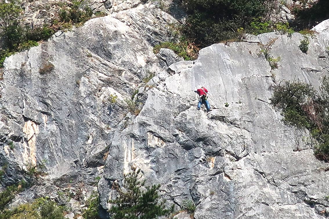 Die Absicherung ist gesamt als gut zu bezeichnen (es gibt einige Bohrhaken und Sanduhrschlingen). In den leichten Passagen etwas weitere Abstände, in der vierten Seillänge sollte man einen Friend 0,5 einsetzen.