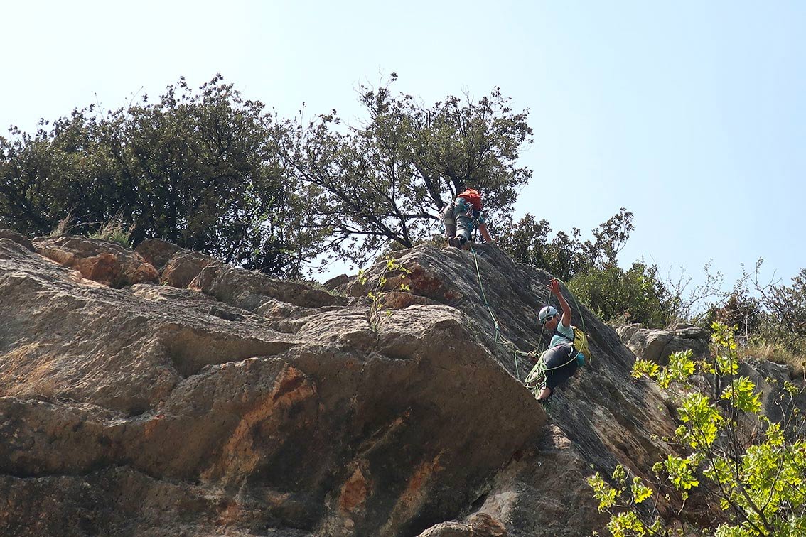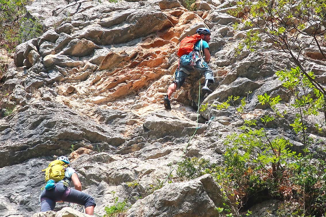 50 m Seil, 12 Expressschlingen, Bandschlingen, einen Cam 0,5 und Helm.