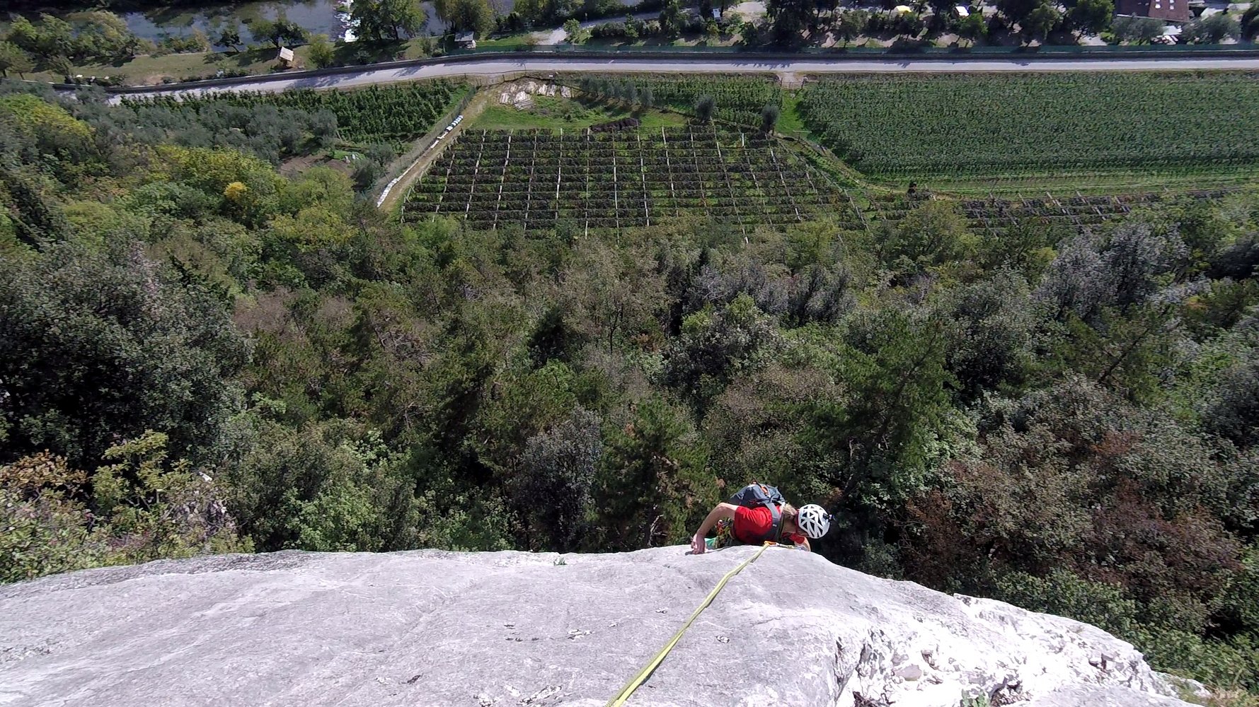 Zur Pizzeria Lanterna und die Straße kurz zurück in Richtung Arco - ein Steiglein führt hinauf zum Klettergarten (mit einem markanten Doppelrissdach). Links auf dem breiten Pfad der Wand entlang, dort wo der Pfad etwas ansteigt, kommt man direkt am Einstieg vorbei. Die Route ist blau angeschrieben. Die Route verläuft im linken Wandteil der Parete San Paolo.