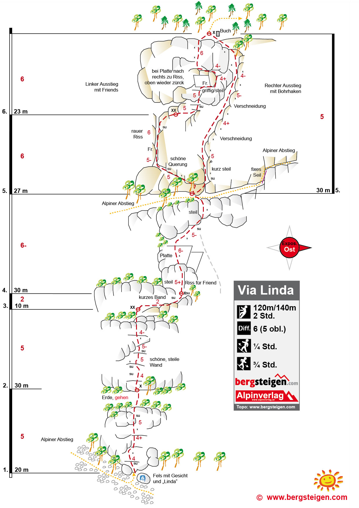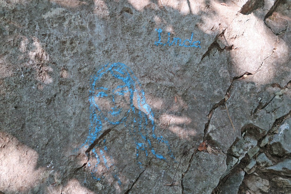 Zur Pizzeria und die Straße kurz zurück in Richtung Arco - ein Steiglein führt hinauf zum Klettergarten (mit einem markanten Doppelrissdach). Links auf dem breiten Pfad der Wand entlang, dort wo der Pfad etwas ansteigt kommt man direkt am Einstieg vorbei (aufgezeichnetes Gesicht von Linda). Die Route ist angeschrieben. Die Route verläuft im ganz linken Wandteil der Parete San Paolo.