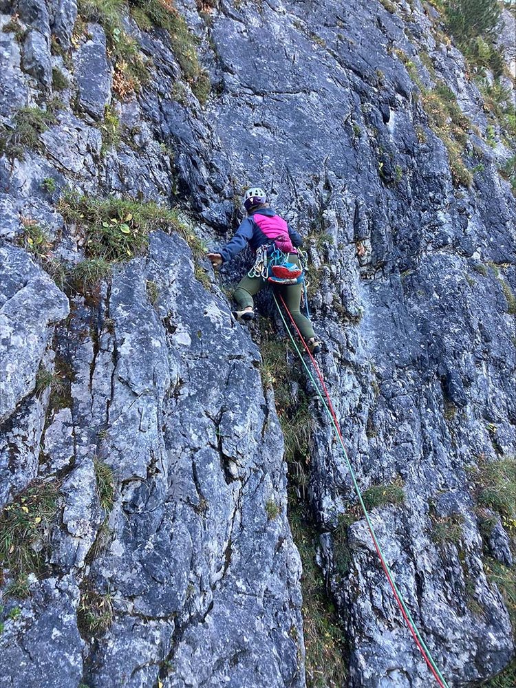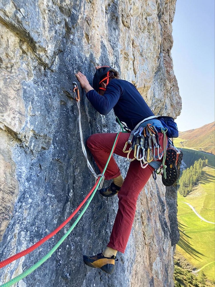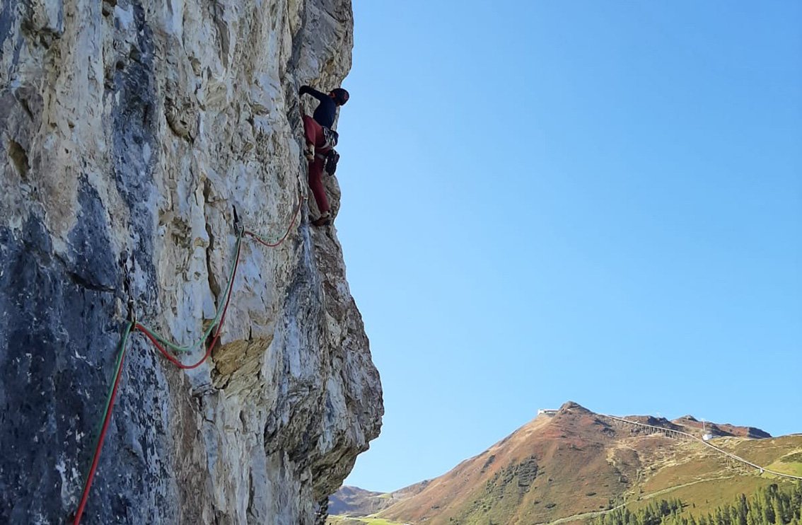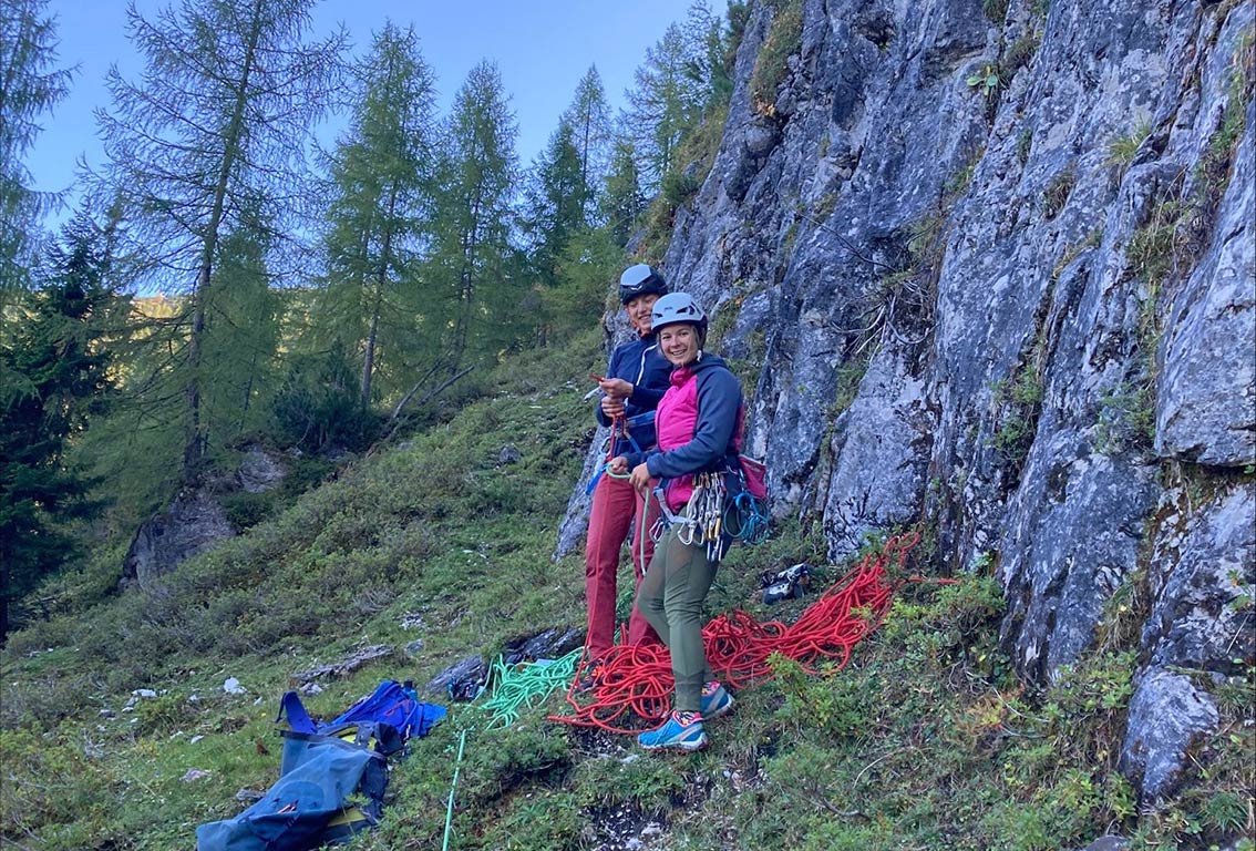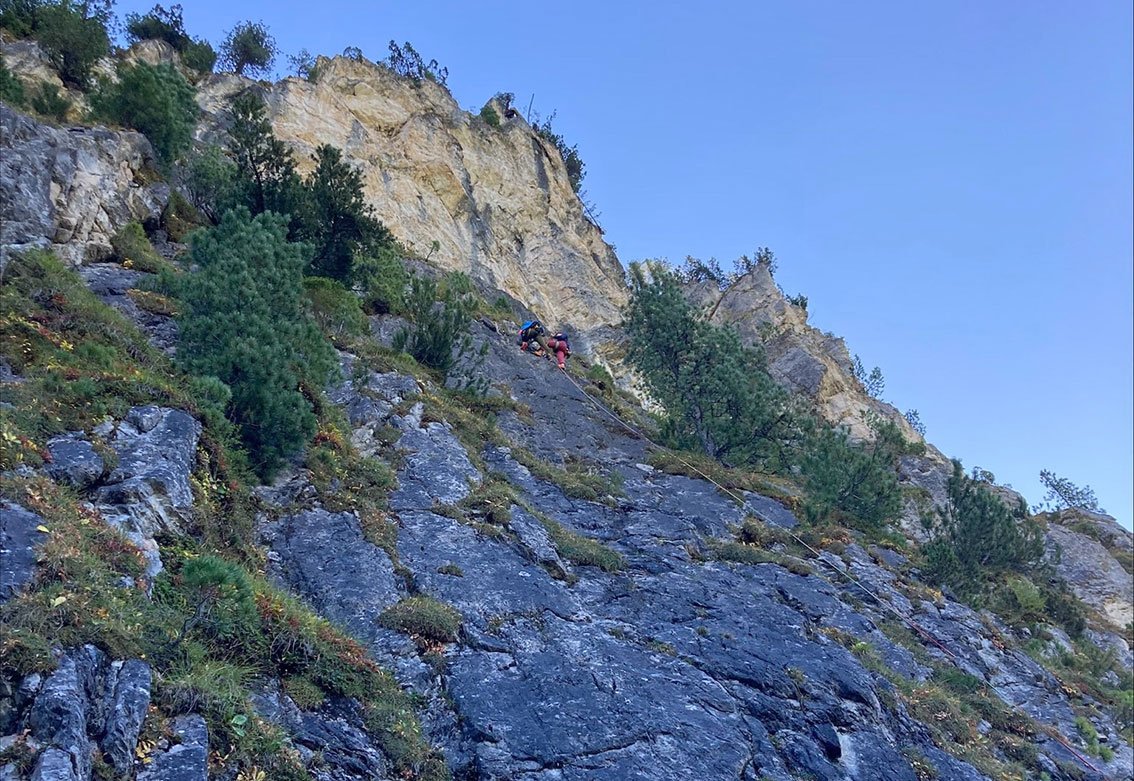 2 x 50 m Halbseile, 15 Expressschlingen und Helm.
