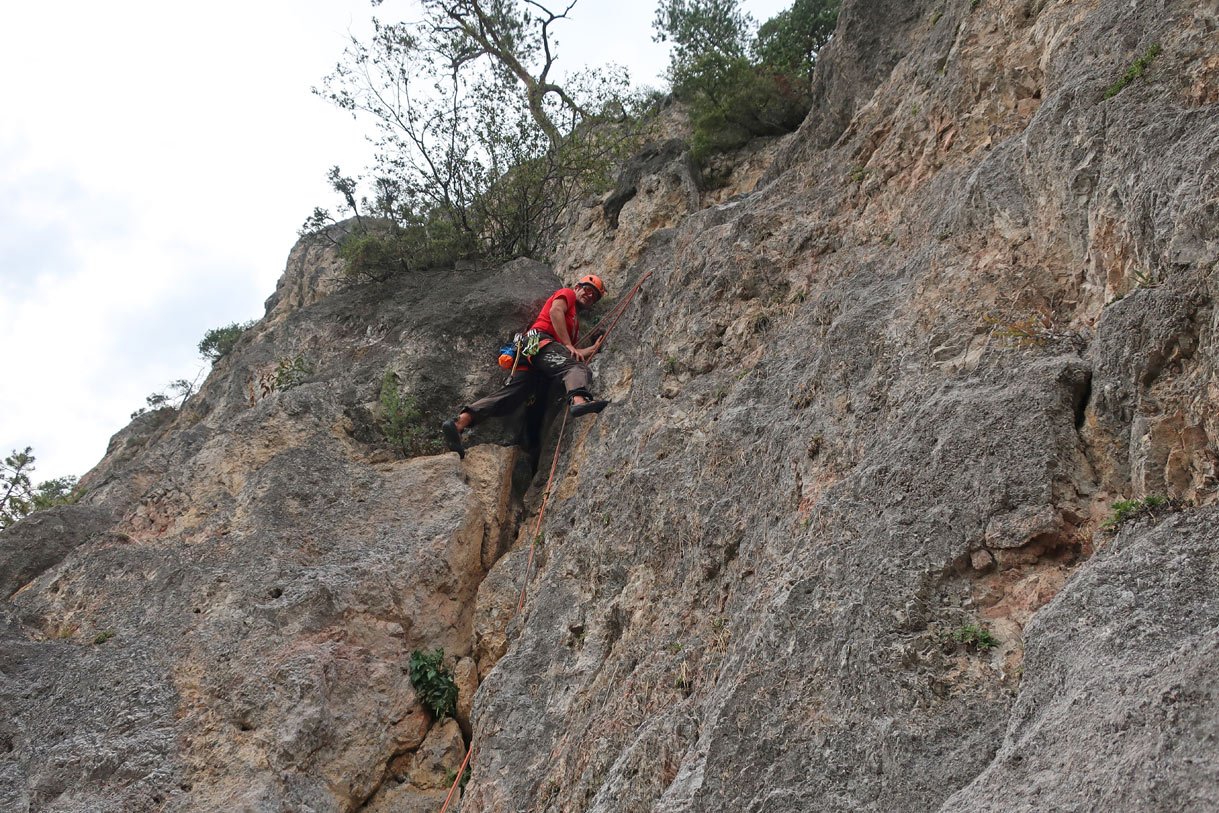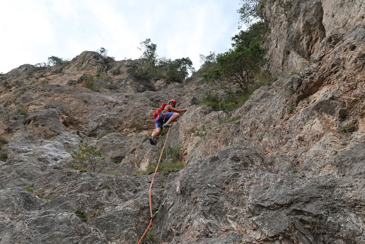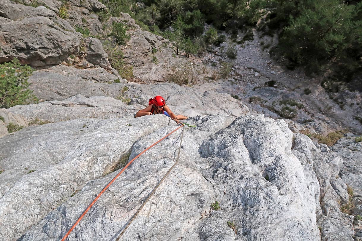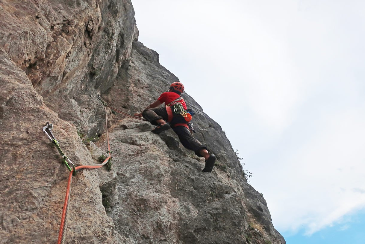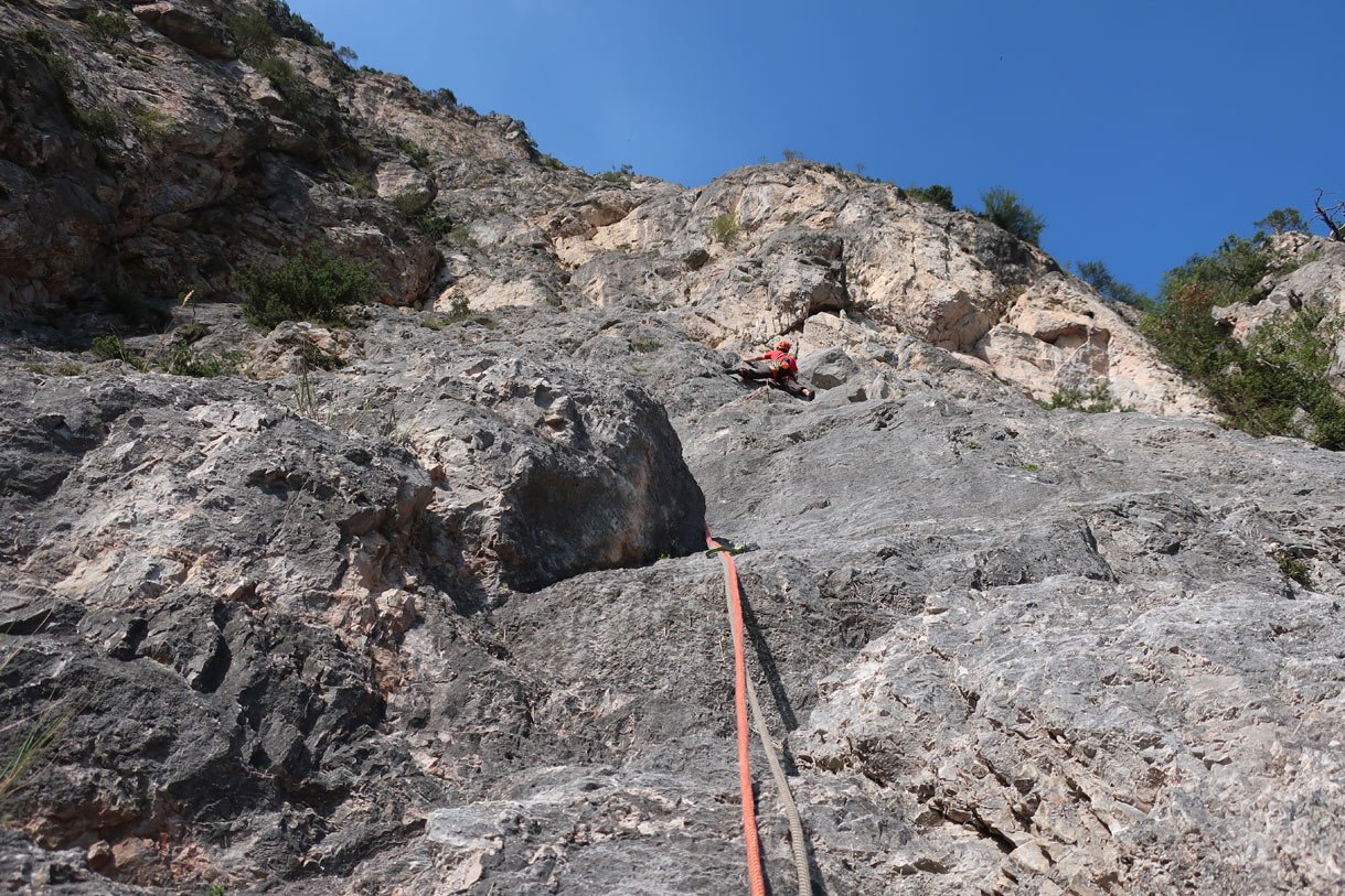 Gut mit Bohrhaken abgesichert, einizig in der ersten Seillänge im leichten Gelände etwas größere Abstände.