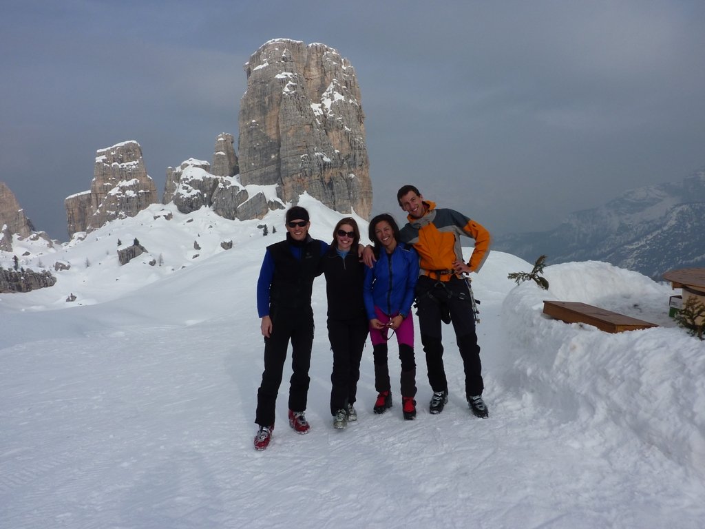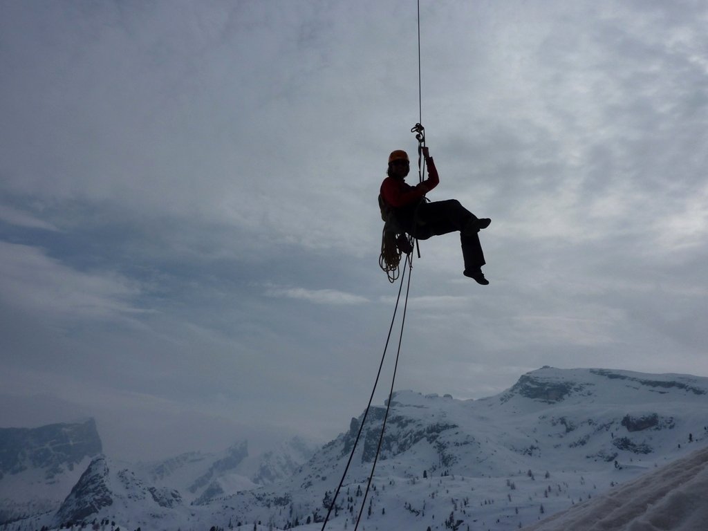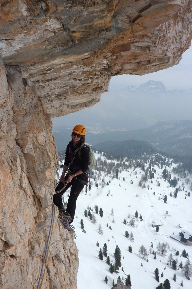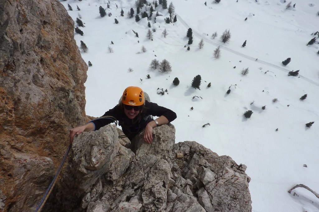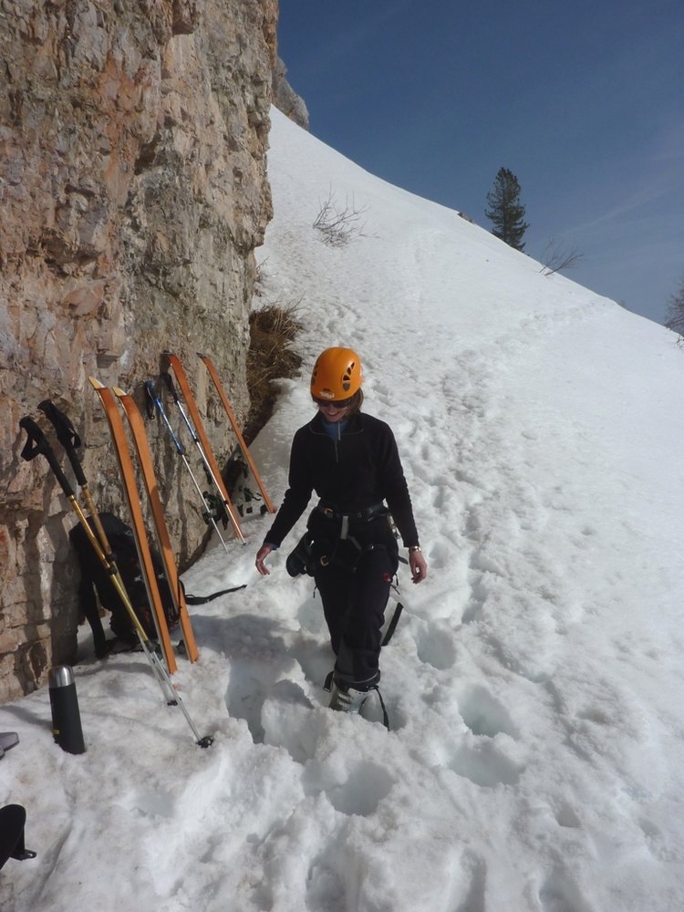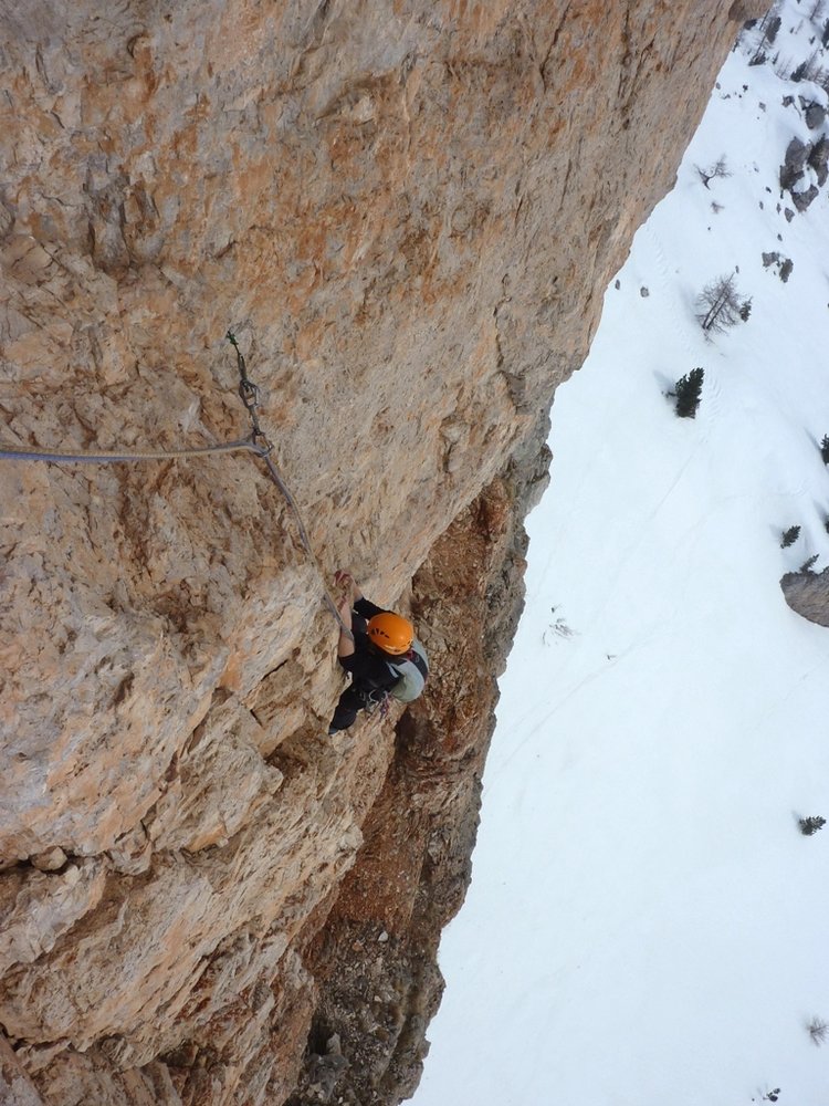 Die Tour ist schon früh im Jahr möglich. Hierfür entweder mit dem Lift auf der Nordseite mit den Ski raufgehen und zum Einstieg queren, oder über die Straße zum Rifugio Cinque Torri mit den Ski aufsteigen und dann rauf zum Einstieg. Der Hang unter dem Torre Grande ist aber recht steil und im März kann hier der Schnee am Nachmittag sehr weich (lawinengefährlich) sein. Lawinenausrüstung ist deshalb trotz der kurzen Strecke absolut empfehlenswert / notwendig. Die Tour ist recht steil, weshalb sich der Schnee hier nicht allzu lange haltet. Wenn man früh einsteigt hat man auch im Frühjahr die ganze Zeit Sonne (Einstieg Südost - Ausstieg Südseite). Im Frühjahr ist diese Tour ein ganz besonderes Erlebnis!