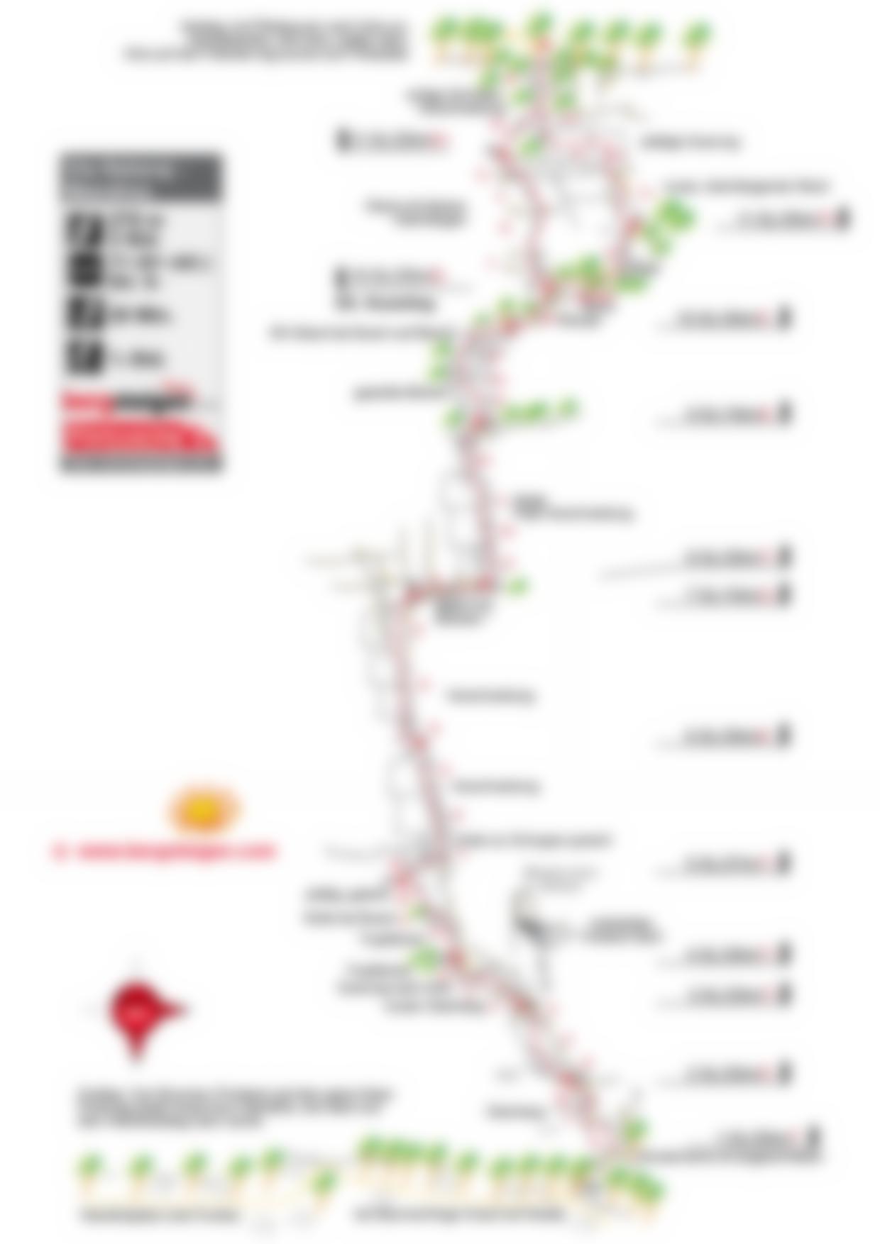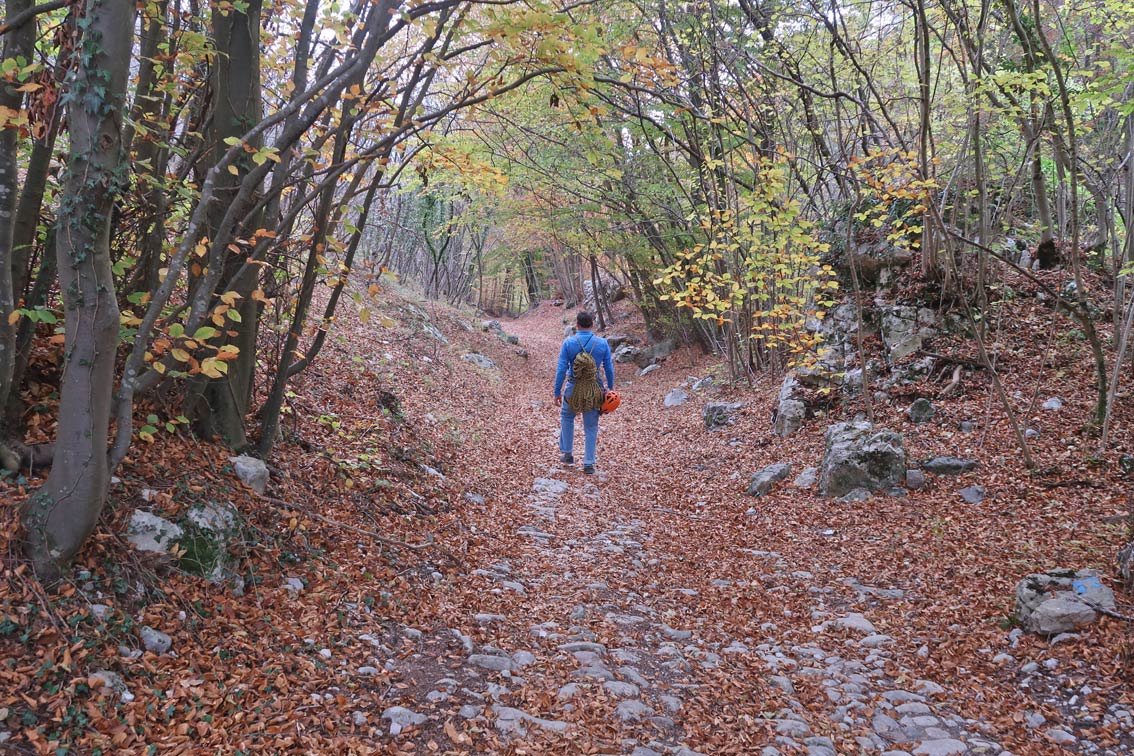Vom Ausstieg auf Wegspuren nach Westen zur Asphaltstraße und dieser nach links folgen bis nach einer großen Wiese rechts und einigen Häusern links auf der linken Seite ein Wanderweg wieder nach Südosten zur Wand führt (dieser steigt auch mal kurz an, man geht eine Strecke direkt an der Felskante). Auf diesem Wanderweg nach Laghel absteigen, dann aber links (guter Wanderweg, rote Punkte) zurück zum Zufahrtsweg. Auf diesem dann zum Kreuz beim Brunnen (Fontane).