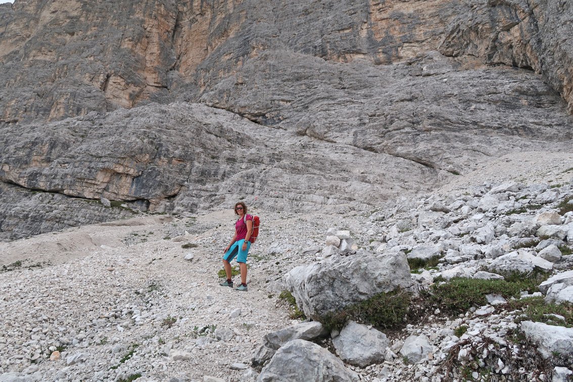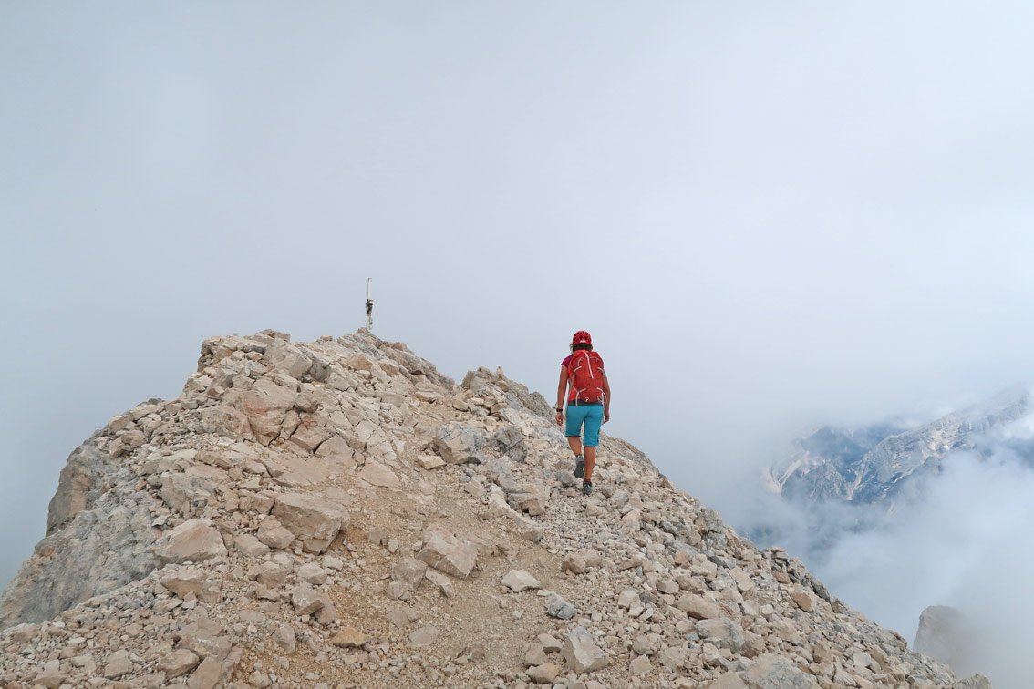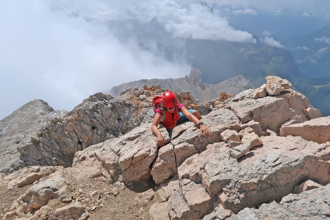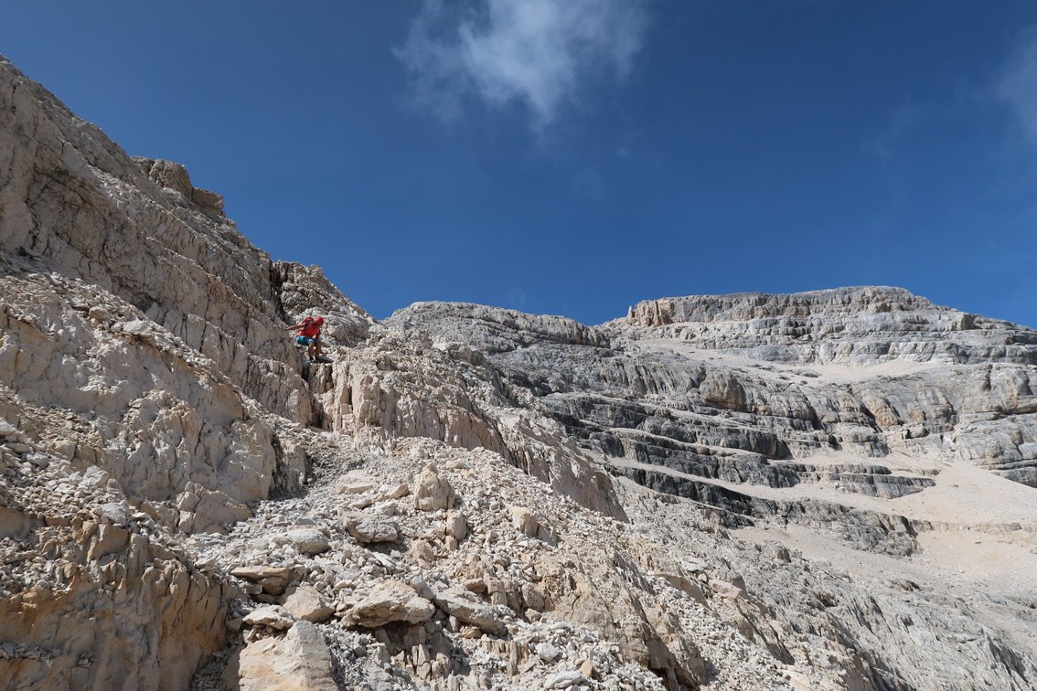 Steinplateau - Gipfel: Auf dem Steinplateau zwischen Blöcken hindurch den Sattel zwischen Spalla Sud und Monte Pelmo ansteuern. Man folgt den Steinmännchen - etwas aufpassen sollte man auf die tiefen Spalten im Fels. Am Ende durch eine Rinne (1-) nach rechts hinauf auf den flachen Sattel. Weiter nach rechts, den Steinmännchen zu einer Plattenrampe folgen (1-), diese dann aber links bei Steinmännchen über einen kurzen Aufschwung (1+) verlassen. Gleich nach dem Aufschwung nach rechts - links im Bereich des Grates kann man aber auch aufsteigen - auf einem Band zu einer Schutthalde. Diese auf Pfadspuren linkshaltend aufwärts - man erreicht einen kleinen, flachen Gratabsatz. Nach diesem steuert man den steilen Zackengrat an. Über eine steile und ausgesetzte Passage (1) erreicht man die Schlüsselstelle (2), eine kurze aber senkrechte Wandstufe (Schlinge, oben sind sehr gute Griffe an denen man sich über die Stufe zieht). Nach der Stufe in wenigen Minuten auf dem flachen Grat gehend zum Gipfel des Monte Pelmo 3168 m.