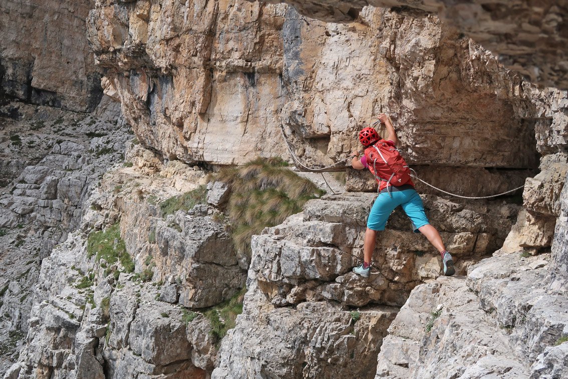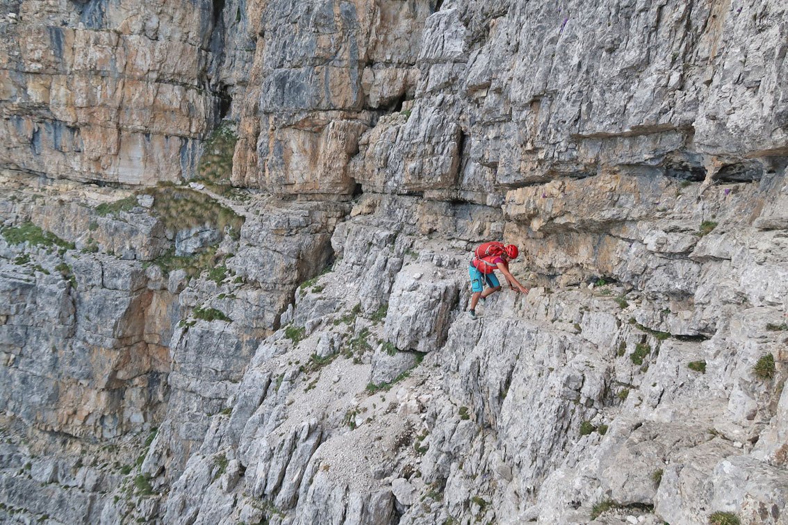 Ball-Band: Nach der Aufschrift "Attacco" anfangs genau der roten Markierung im Zickzack aufwärts folgen (Stufen bis 2-), man erreicht dann einen Pfad im Schutt und folgt diesem nach links - immer auf die Steinmännchen achten. Der Pfad wird schmaler und man erreicht den Beginn eines Felsbandes (kurze Stufe hinauf auf das Band; 1). Weiter auf dem Felsband (Stellen bis 1-, wenige Bohrhaken, Normalhaken und Sanduhrschlingen). Bei einem Block klettert man kurz abwärts (1), dann weiter auf dem Band (1- und gehen) bis in die erste Schlucht. Nach der ersten Schlucht folgt eine Passage mit 3 Fixseilen in Folge (1+, div. Haken). Weiter dem Band folgen, einmal kurz absteigen und weiter in die zweite Schlucht. Aus der zweiten Schlucht hinaus zur Ecke - Wiesenabsatz mit zwei kleinen Bäumchen. Nach der Wiese wieder auf dem tlw. sehr schmalen Band weiter zur ehemaligen Kriechstelle (Passo del Gatto - Katzengang), diese wird mit Hilfe eines Fixseiles luftig umklettert (2-). Danach erreicht man die dritte Schlucht. Nach der Wasserlaufquerung kurz in einer Kehre höher, dann auf dem oberen Band zu einer glatt polierten Ecke (1+, Normalhaken). Nach dieser Ecke erreicht man einen Absatz mit einem einzelnen Bäumchen.