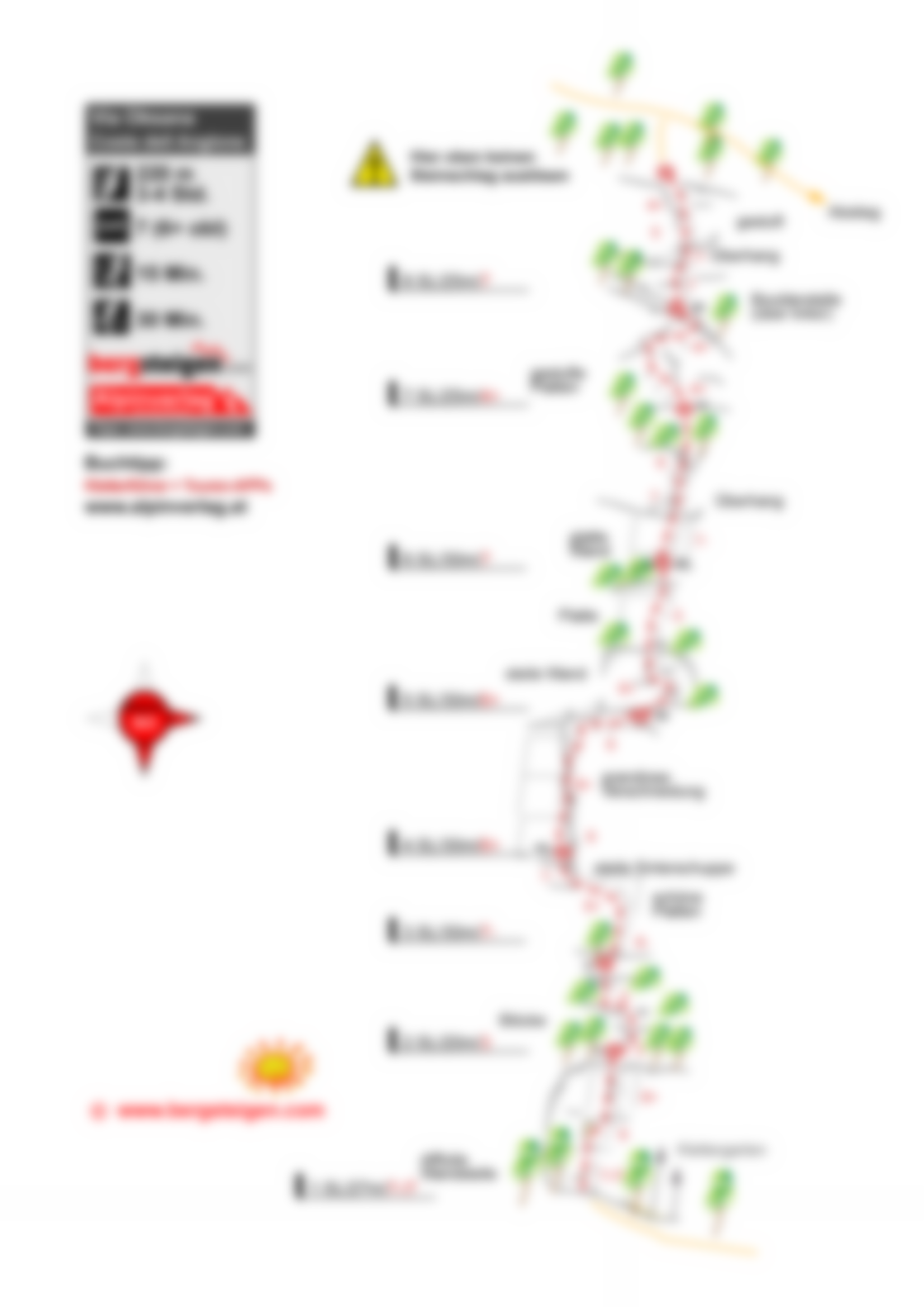 Achtung: In der 7. Seillänge sind mehrere Quadratmeter Fels ausgebrochen, die zum Teil noch in der Route liegen. Zwischen der zweiten und dritten Seillänge fehlt der Standplatz, der Baum wurde durch den Felssturz bis zum Wandfuß mitgerissen. (Ein Stand ist am ersten Haken der 3. Seillänge + SU möglich.) In der 3. Seillänge (ca. 3) sind mehrere Bohrhaken beschädigt und können nicht regulär verwendet werden. Die Tour ist zum aktuellen Zeitpunkt (August 2025) sehr unangenehm zu klettern und wirklich gefährlich.