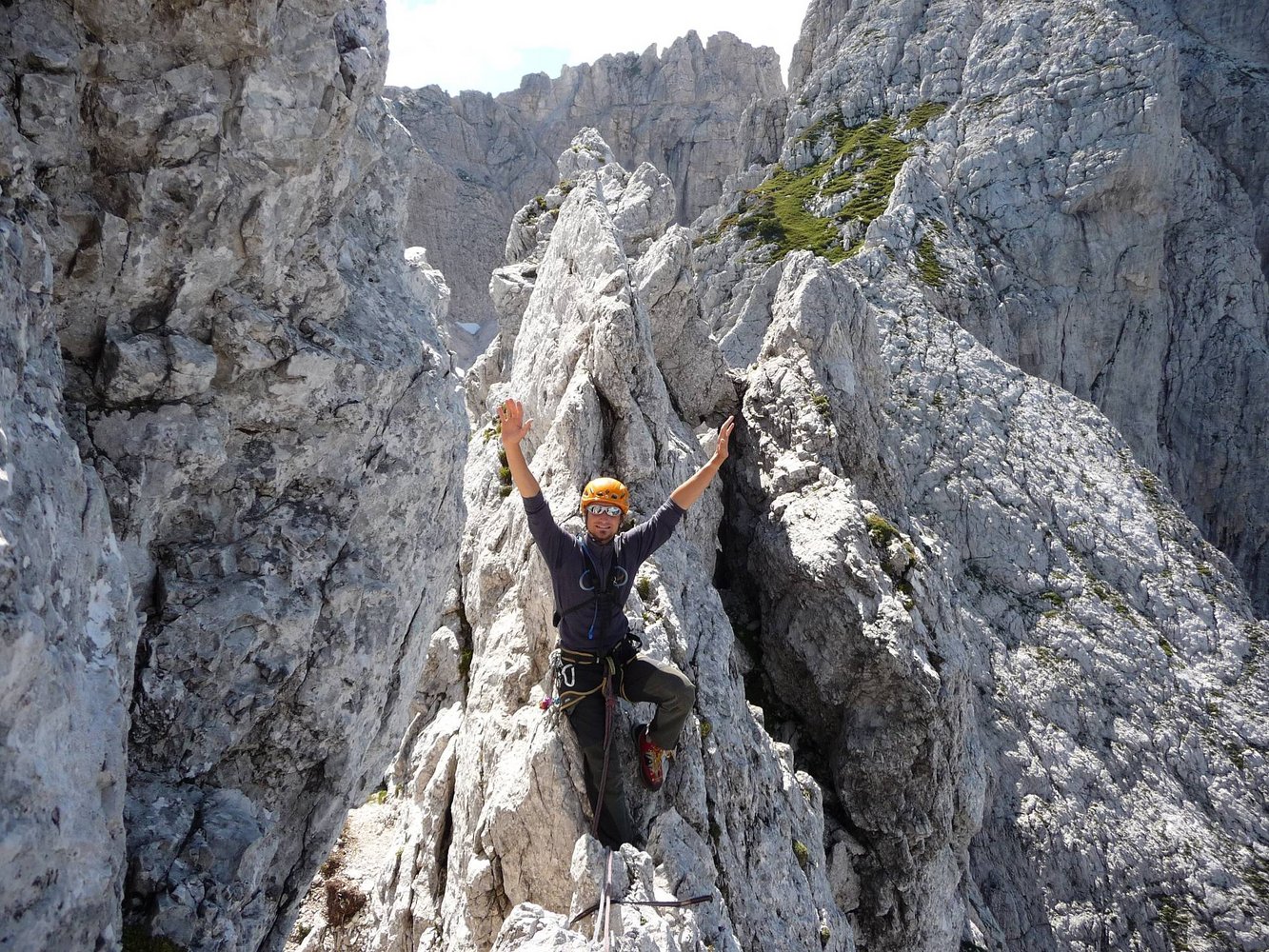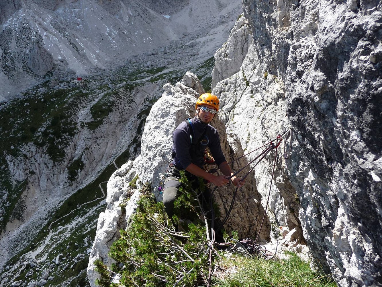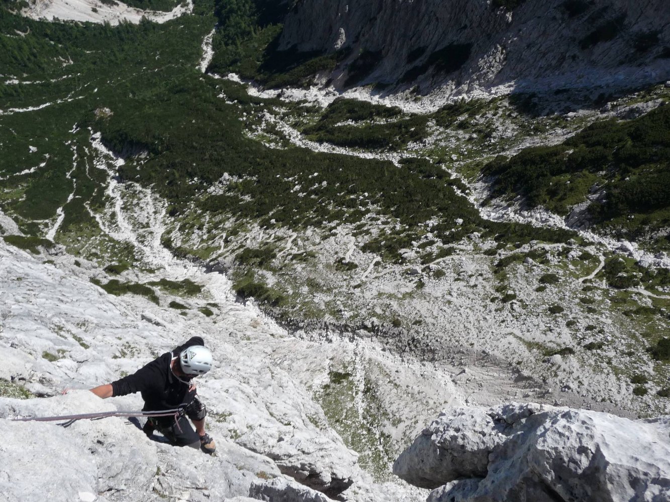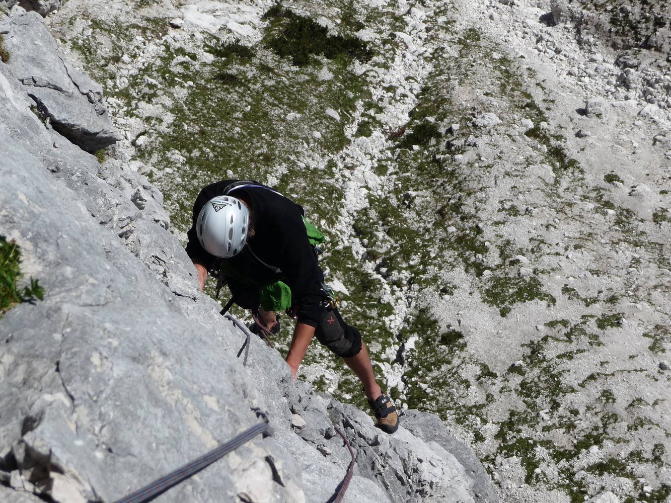Die Picilli/Rossi an der Südwand der Kleinen Leiterspitze ist eine der wenigen gebohrten mittelschwierigen Alpintouren in den westlichen Julischen Alpen. Die Absicherung ist gut, das eine oder andere Mal empfiehlt es sich zwischen den Bohrhaken etwas zu legen - vor allem in den leichteren Passagen kommen recht große Hakenabstände vor.