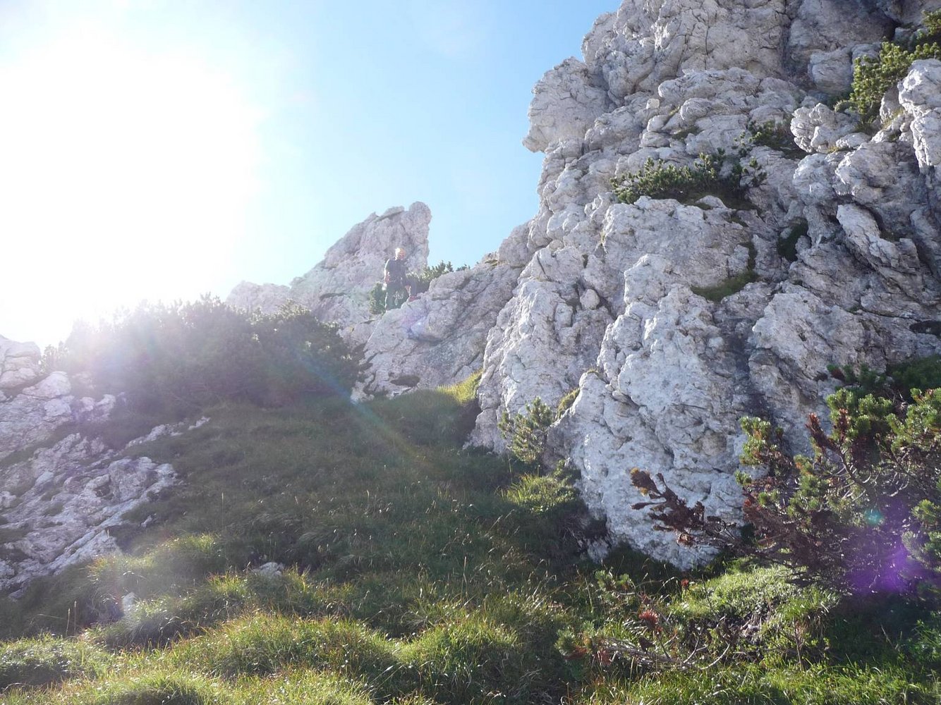 Der Abstieg ist mit Steinmännern markiert, läßt jedoch mehrere Varianten zu. Vom Gipfel klettert man ca. 15m in steilem Gelände (II) ab. Nun folgt man über Schrofengelände in eine Scharte und folgt einem grasigen Rücken (Steinmänner) bis man an Latschen rechts geht. An mehreren Steinmännern vorbei geht man über steile Wiesen zwischen Latschen abwärts, um schließlich wieder nach links zu queren (Steinmann). Man gelangt zu einer felsigen Rinne. In ihr steigt man ca. 20m direkt ab, danach hält man sich an der linken Seite der Rinne bis man ein markantes Felsband erreicht. Diesem folgt man nach rechts (Steinmänner) und gelangt schließlich zu der markanten Rampe, die durch die Südwand zurück zum Einsdtieg zieht.