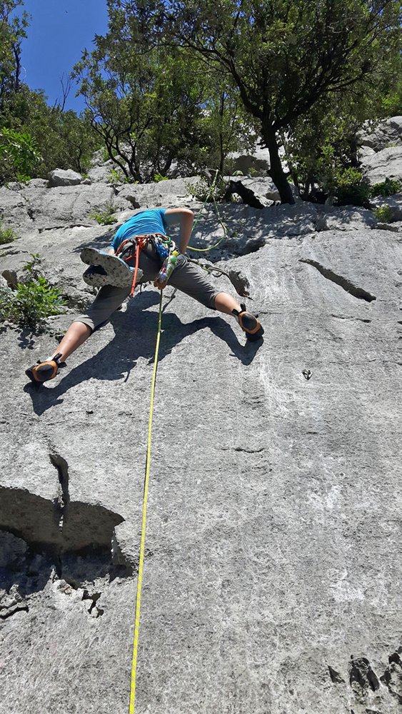 Schöne, kurze Plattenroute, die man gut mit anderen Routen oder mit dem Klettergarten gleich darüber kombinieren kann. Der Anstieg verläuft über schöne Platten, die durch kleine Bänder getrennt sind. Der Name Via Plaisir ist vielleicht ironisch gemeint – den 5ten Grad sollte man sehr sicher klettern um - bei dieser an sich sehr schönen Route - als Vorsteiger seinen Spaß zu haben.