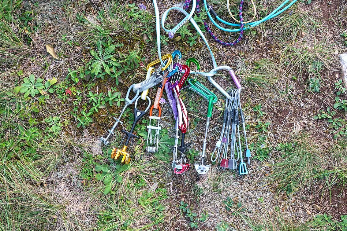 50 m Seil, 8 Expressschlingen, Bandschlingen für Sanduhren und Baumstände sowie einen Helm. Evtl. ein Klemmkeil Grundsortiment.
