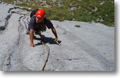 Vier Seillaengen 6 (6- obl): 4+, 6-, 6, und 6-, dann die Wetzsteinplatte weiter ( 4+, 5-, 6-, 4+ und 4-).