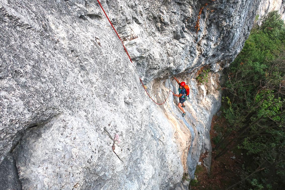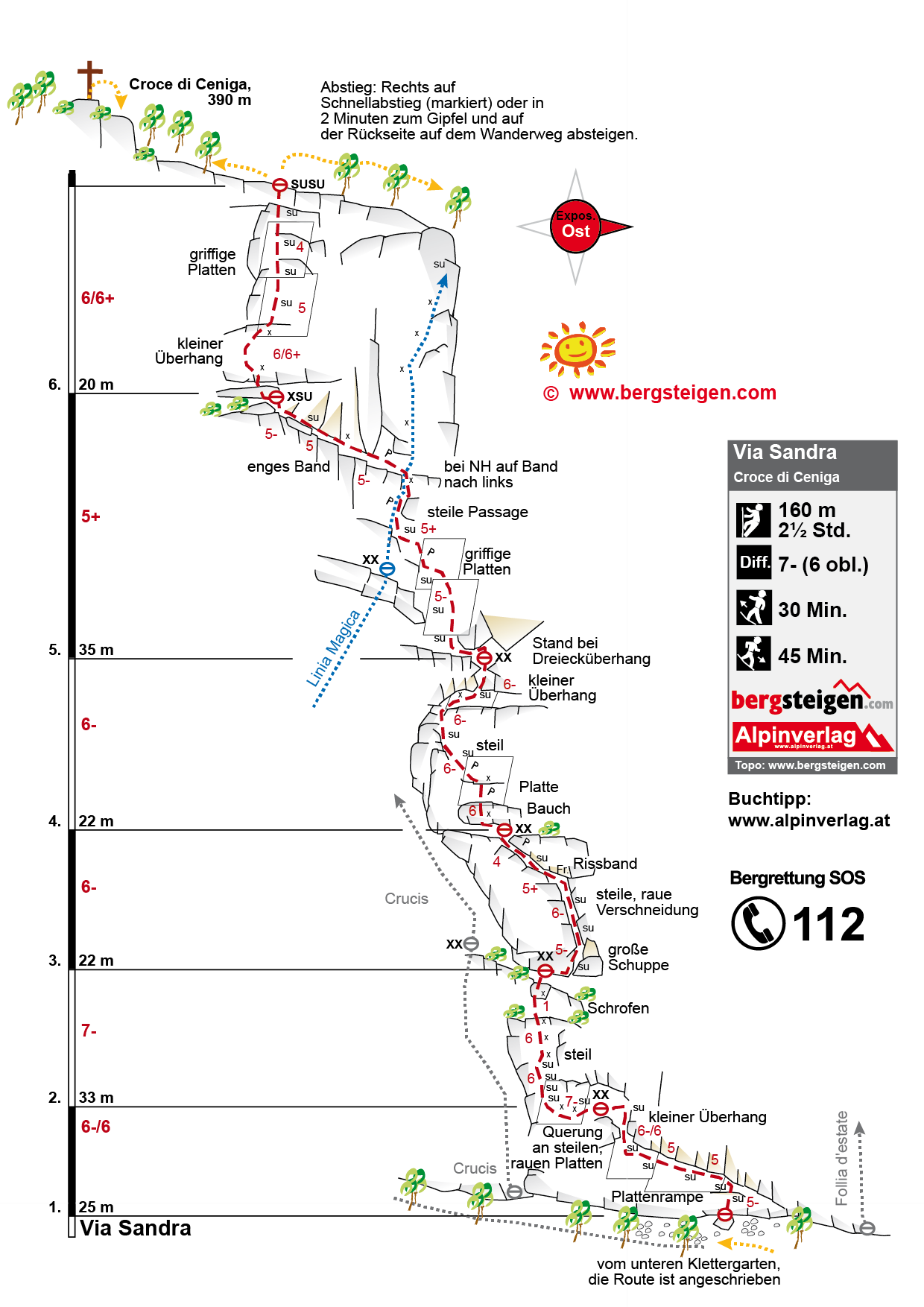 Die Via Sandra ist eine wirklich schöne, aber recht ausdauernde Route an der Ostwand unterhalb des Croce di Ceniga. Fast in jeder Seillänge ist Ausdauerpower gefordert, da mit vielen gebohrten Sanduhren gesichert, packt man instinktiv noch etwas fester zu. Die Route ist aber lohnend, perfekter Fels vom Einstieg bis zum Ausstieg.