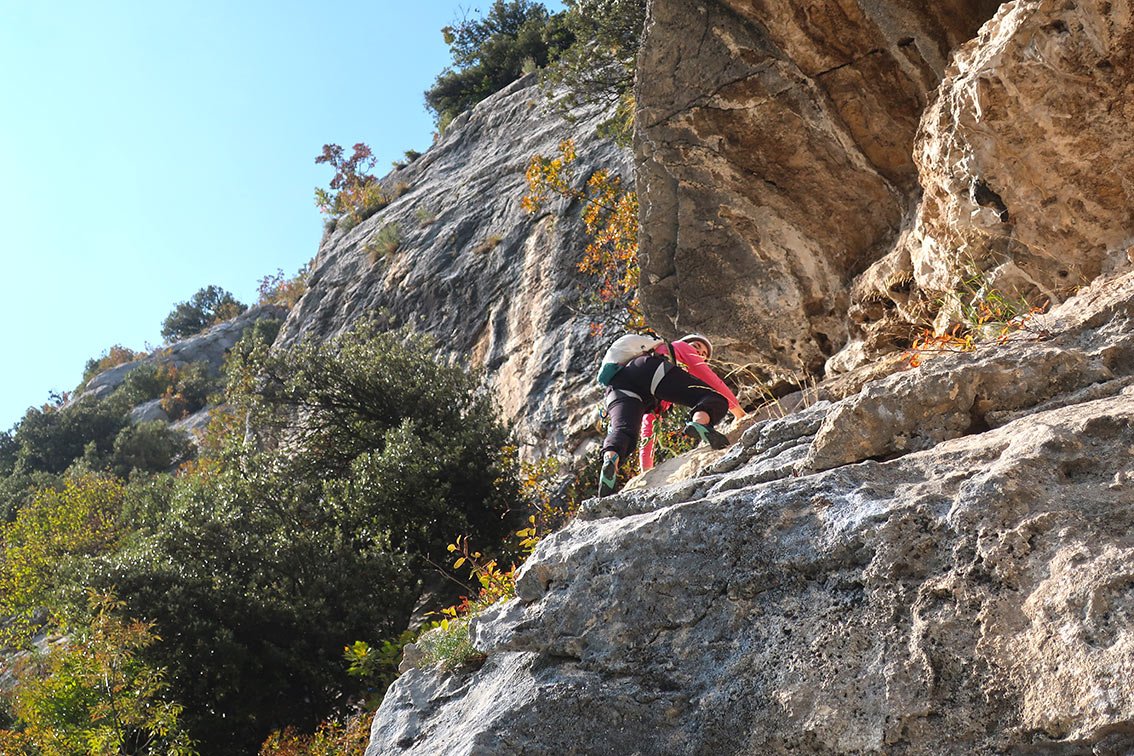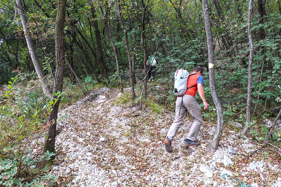 Vom Ausstieg auf Pfadspuren zuerst kurz etwas aufwärts, dann aber gleich nach rechts. Auf einem später steileren Pfad nach unten (Punkte an Bäumen und Felsen) bis man wieder auf das Einstiegsband gelangt, auf diesem zum Einstieg. Dann auf dem schon bekannten Zustiegsweg zurück zum Ausgangspunkt.