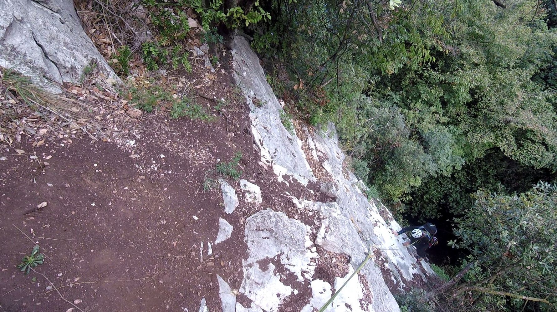 Vom Ausstieg auf dem Wiesenkamm nach links oder rechts auf- bzw. absteigen. Nach einer Weile führt der Weg bei einem kleinen Steinmann nach links hinunter in die Büsche (nicht vorher über die steile Wandstufe abklettern). Ein Pfad führt zum Abstiegsweg, auf diesem nach rechts hinunter zur Straße und auf dieser zurück zum Parkplatz unterhalb der Einsiedelei.