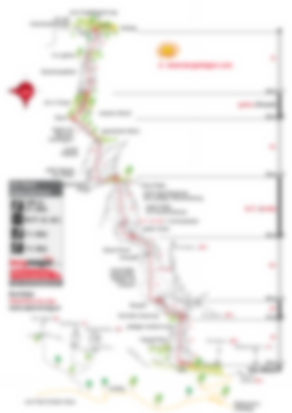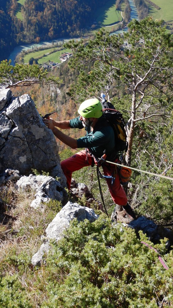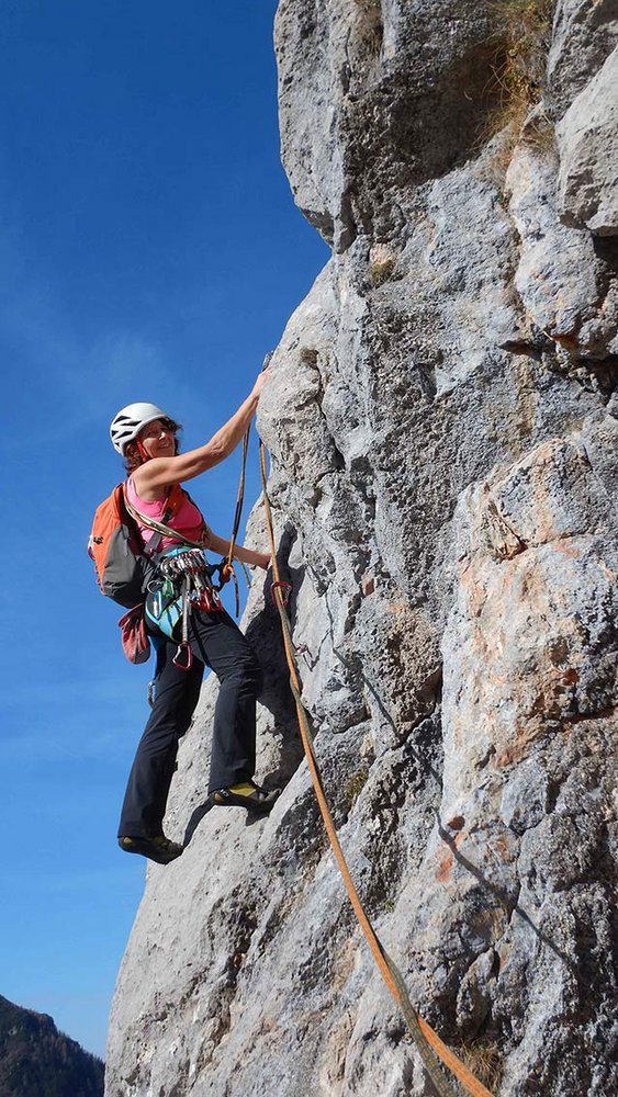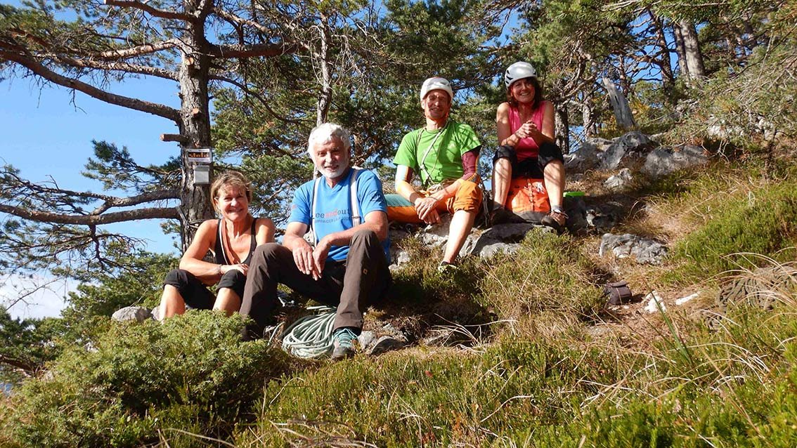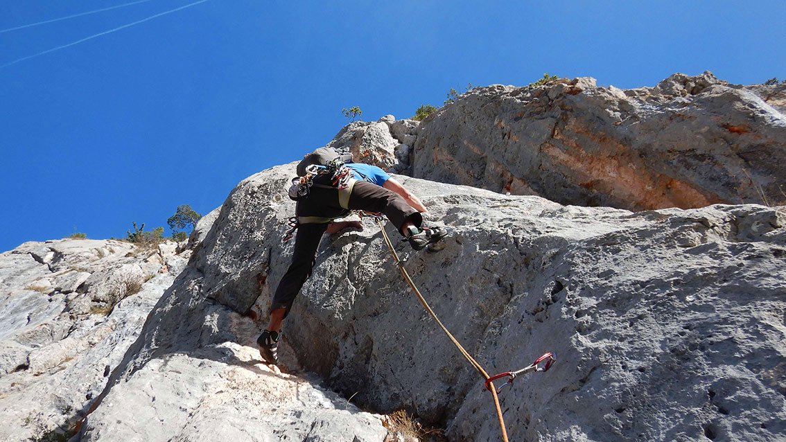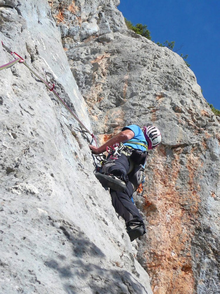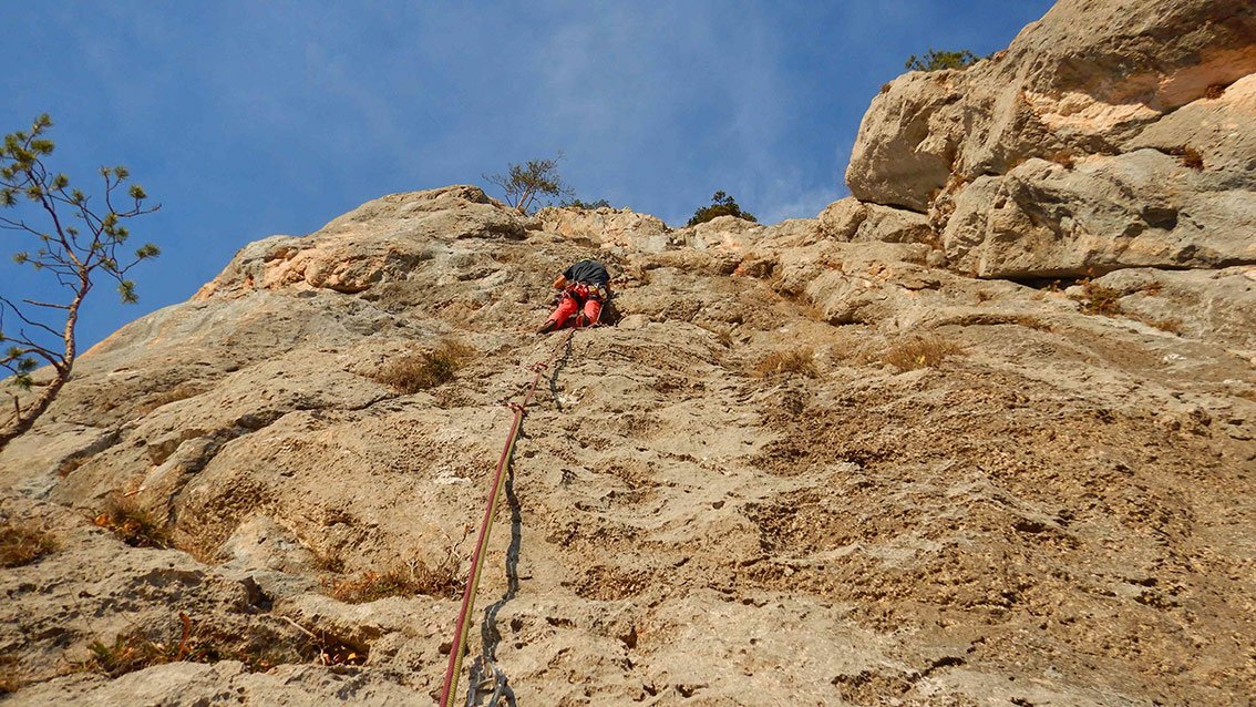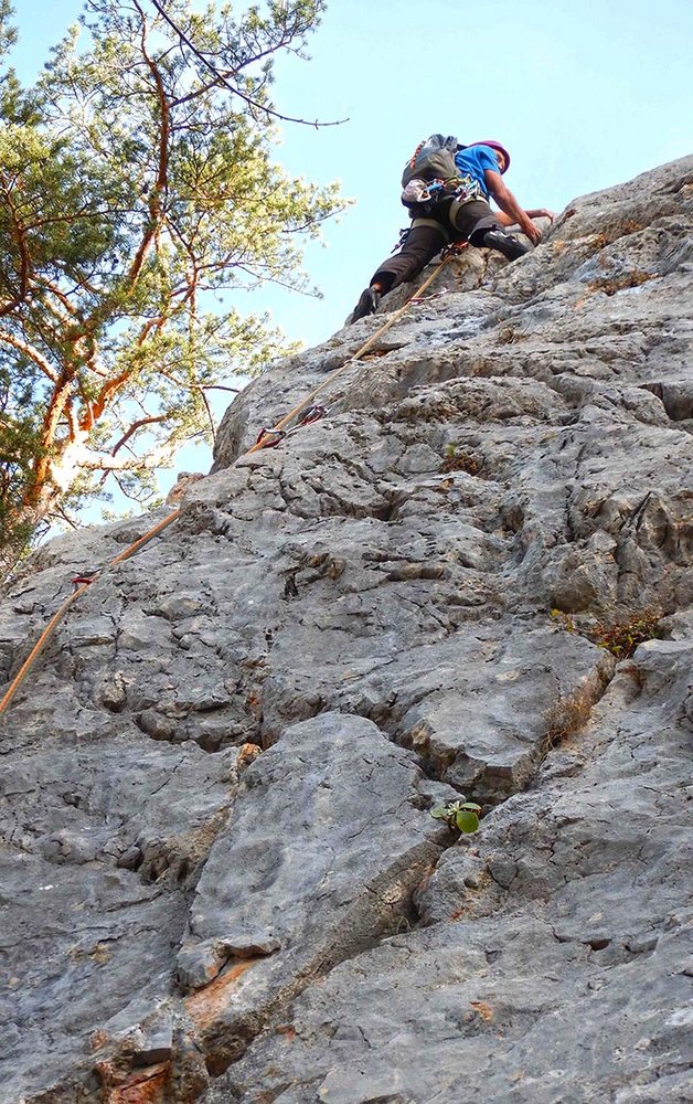 Siehe Topo. Die ersten 4 Seillängen bieten fantastische Klettereien in sehr festen, nahezu senkrechten und griffigen Fels. Nach einem 20 m, mit Fixseil versicherten, Weg, (Achtung loser Block!) gelangt man zu einem blockigen Pfeiler mit mehreren Aufschwüngen lll-V, bevor man an einem Baum direkt zum Abstiegsweg gelangt (Stand mit Wandbuch).
