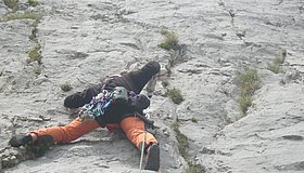 11. SL: das Wandl hinauf (3) und leicht schräg nach links über Bänder zur Wand. An einer kleinen Schuppe hinauf und durch die Wand (6) zu einer kurzen Verschneidung klettern. Von da nach links queren und hinauf über einen kleinen Überhang (6+) zum nächsten. Diesen links umgehen und schräg nach rechts zum Stand auf einer Kanzel (55m, 6+).