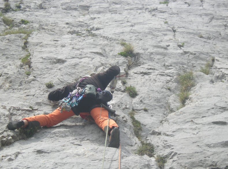 8. SL: durch eine Rinne 5-7 Meter, dann nach links über eine kurze Wand raus. Nun gerade hinauf 35-40 Meter im leichten Gelände (3) und zurück in die Rinne. Nach weiteren 10 Metern Stand rechts von einem Kamin (55m, 3).