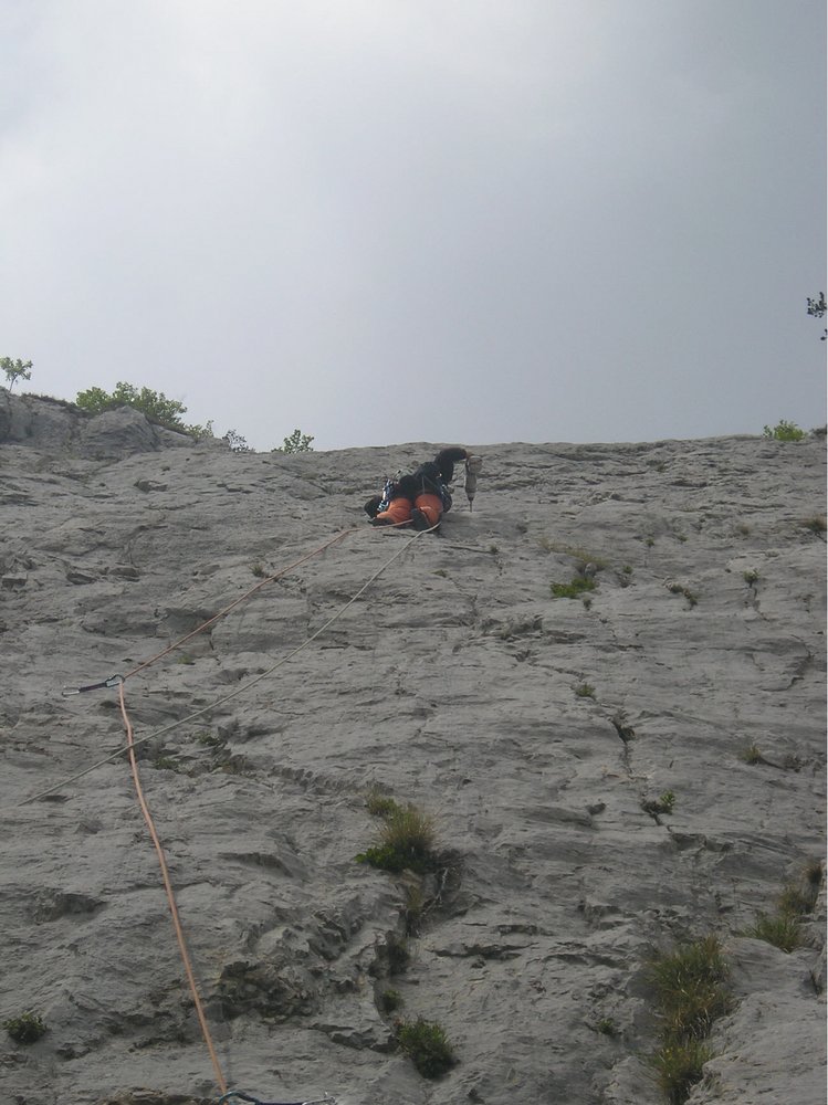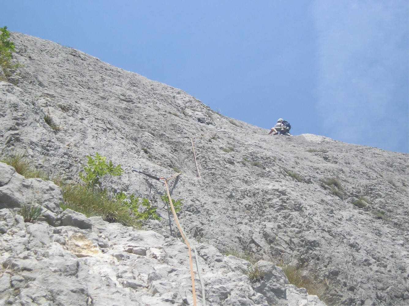 Ausstiegs – SL: circa 30 m nach rechts queren, dann leicht links empor steigen (6-8m) und wieder nach rechts zu einer markanten Pinie queren (55 m, 1-2 und Gehgelände, BH und NH, ausgesetzt). Weiter nach rechts zwischen Bäumen und dann links von einem Pfeiler zu einer Scharte empor steigen (Gehgelände).