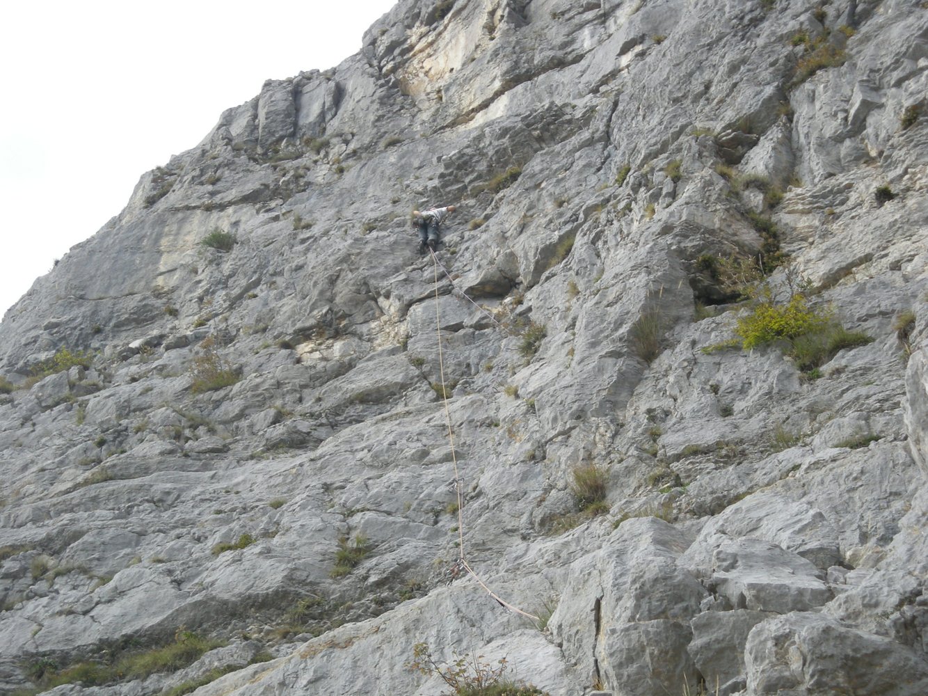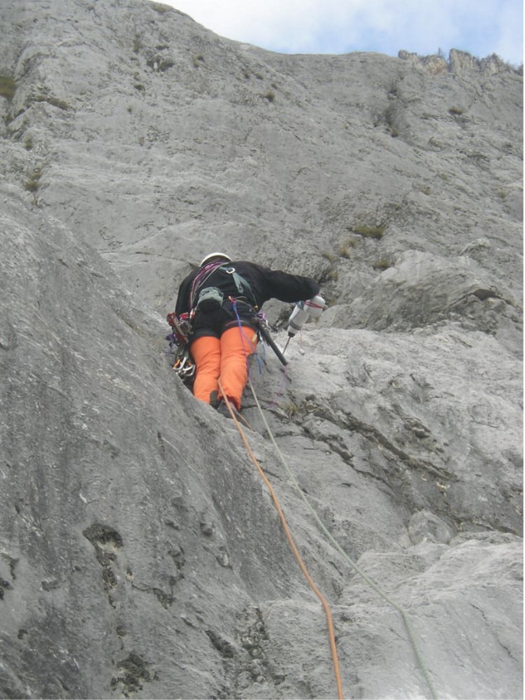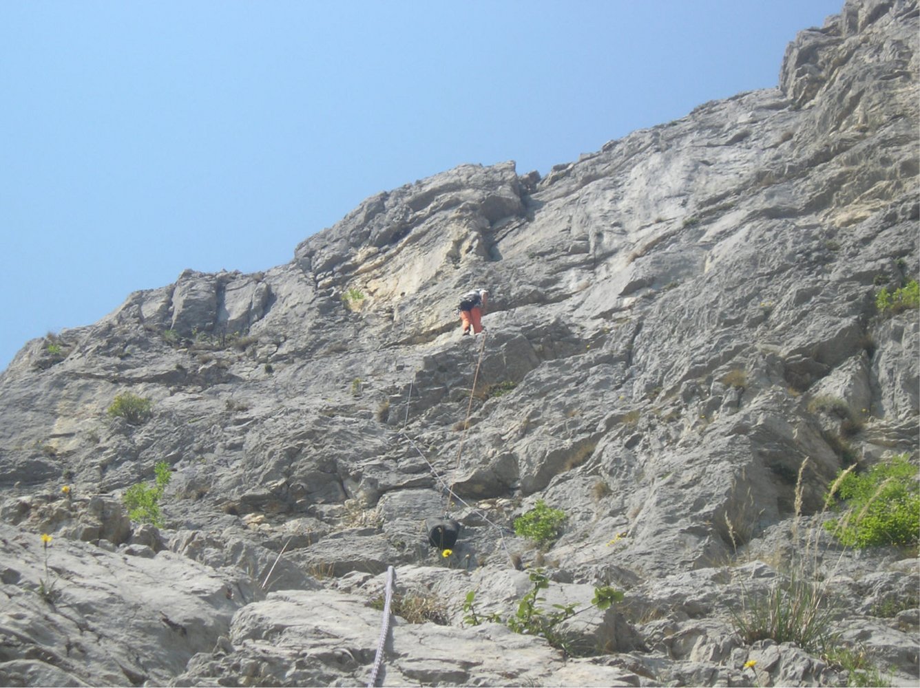 (Achtung, ca. 40 m weiter links befindet sich der Einstieg einer uns unbekannten Routen mit GELB Chromatierten Bohrhaken!).