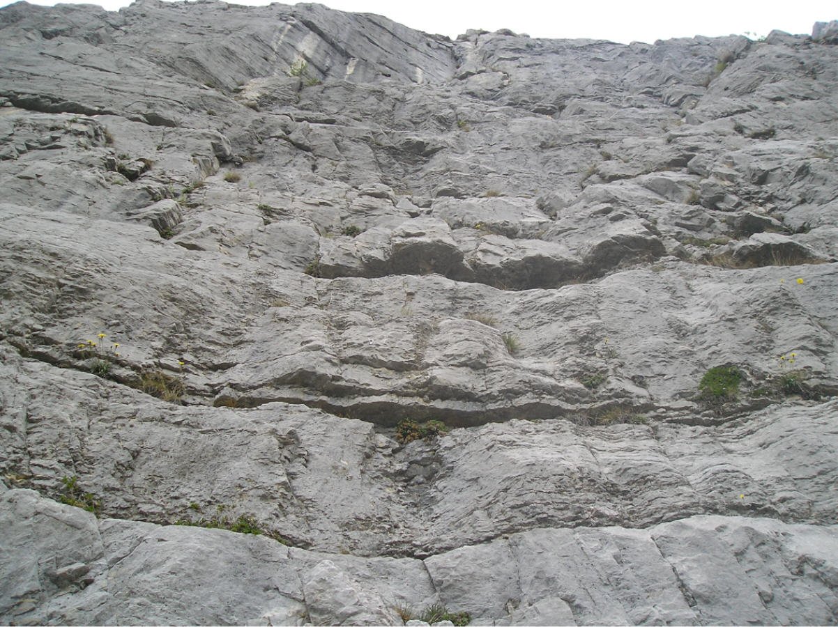 13. SL: die Wand empor 30 Meter zunächst gerade (6-) dann leicht links haltend (7-) zum Anfang einer steilen Rampe. Hier quert man nach rechts steigend zu einer markanten leicht überhängenden Verschneidung. Die Verschneidung hinauf (6-) zum Stand auf einem Felsband (55m,7-).