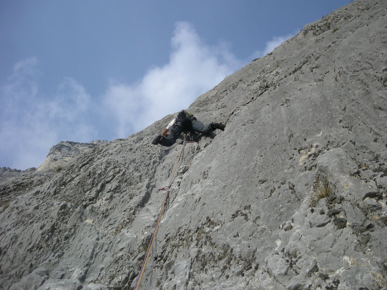 12. SL: durch die Wand hinauf (6, 6+) zu einer Verschneidung, an deren Ende unter einem Dach nach rechts in die nächste Verschneidung queren (6+) und diese empor auf ein Band. Hier nach rechts zu einer grasigen Verschneidung (3) queren und hinauf zum Stand auf einer Terrasse (55m, 6+).