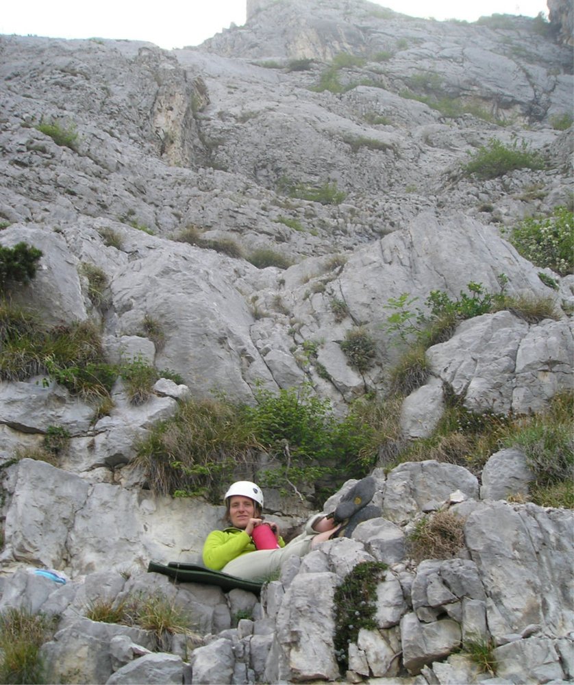6.SL: durch die Wand schräg nach rechts (5) zum Ende einer Verschneidung, dann 15m der leichtesten Möglichkeit folgend schräg nach links (5-) und gerade hoch zu einem steilen, dunklen Wandl (5+) und schließlich rechts hinausqueren auf eine Kanzel (55m, 5+).