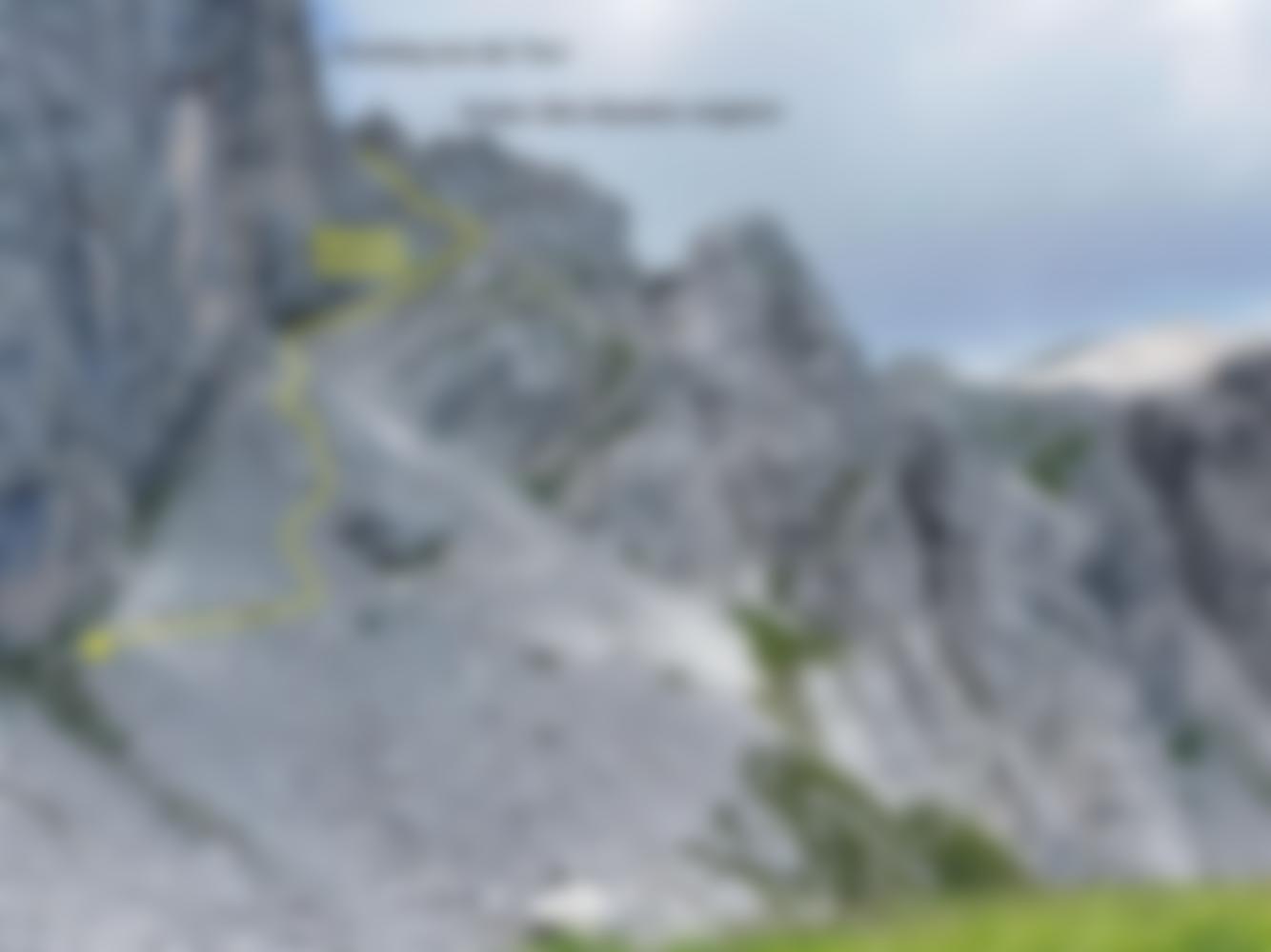 Vom Bohrhaken auf der Südseite des Grats seilt man sich einmal 30 Meter ab. Nun gerade über das teils schottrige, teils grasige Schrofengelände absteigen (teils Steinmänner). Wenn das Gelände breiter wird, quert man leicht fallend nach rechts Richtung Wand und gelangt so zum vom oben bereits sichtbaren Weg. Eine alternative, grasigere und steiler Variante umgeht die von oben nicht sichtbare (zentrale) Wand, die man umgehen muss, über links, wobei man aber nicht die markante Rinne nimmt, die man eventuell nehmen möchte. Man bleibt zunächst eher zentral, schlängelt sich um kleinere Platten hinunter und nimmt dann diese grasige Rinne, ehe man den Weg erreicht. Nun nach Westen in den Sattel, über den Schottersteig entlang der Enziantürme (I Campanile de Genziane) hinunter, bei der Weggabelung nach Nordwesten hinauf zum Passo dei Cacciatori (2213m, Reste von Stellungen des 1.WK). Nun den Weg, der den Kessel ausgeht Richtung Hochalpl nehmen, unterhalb des Passo di Sesis führt dann ein Weg (Beschriftung am Stein „Luggau“) Richtung Bladner Joch zurück. Von dort den bekannten Weg zurück zum Auto.