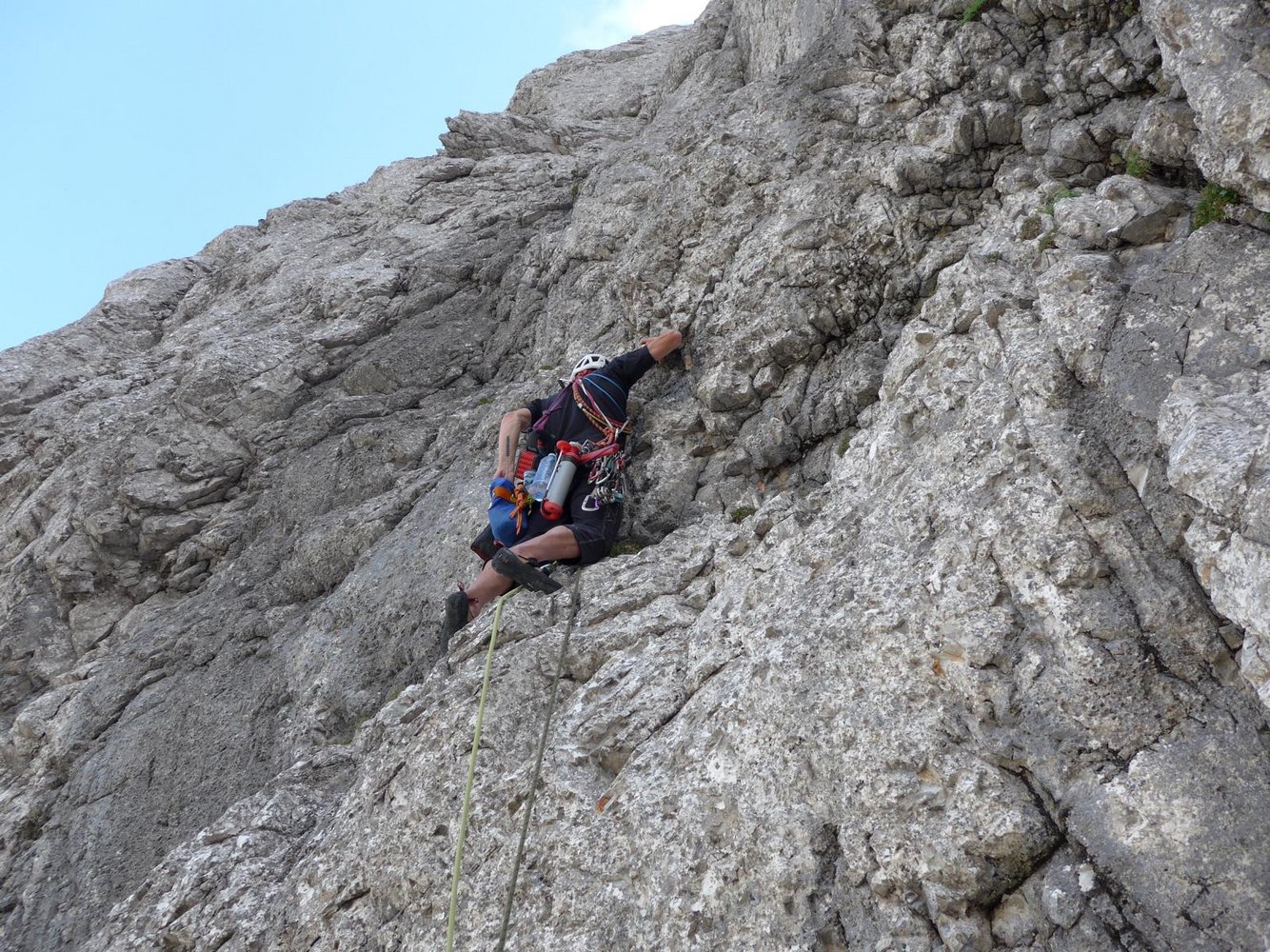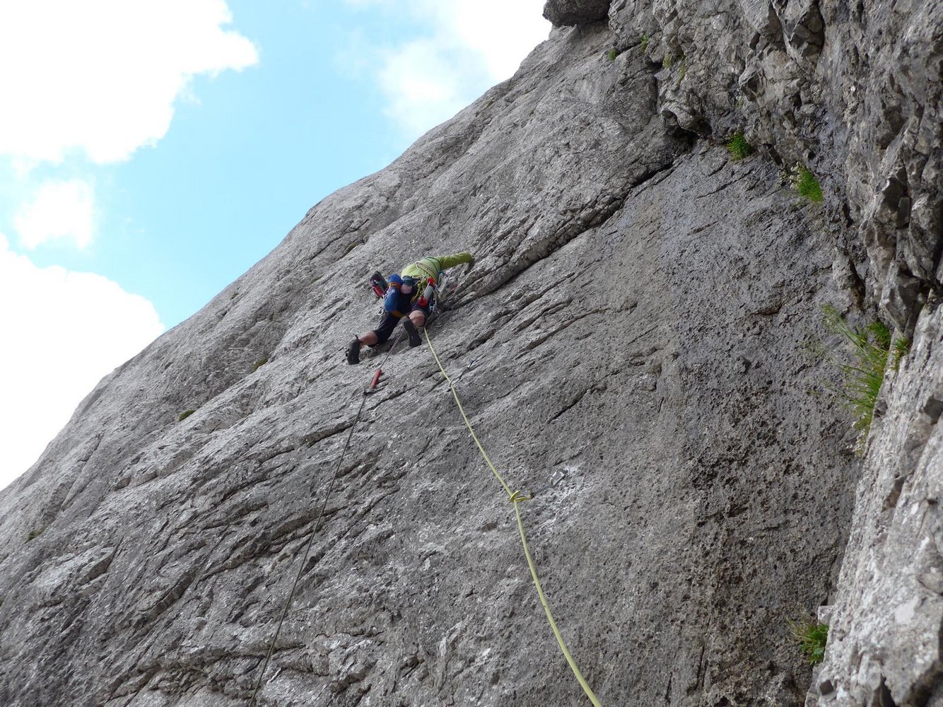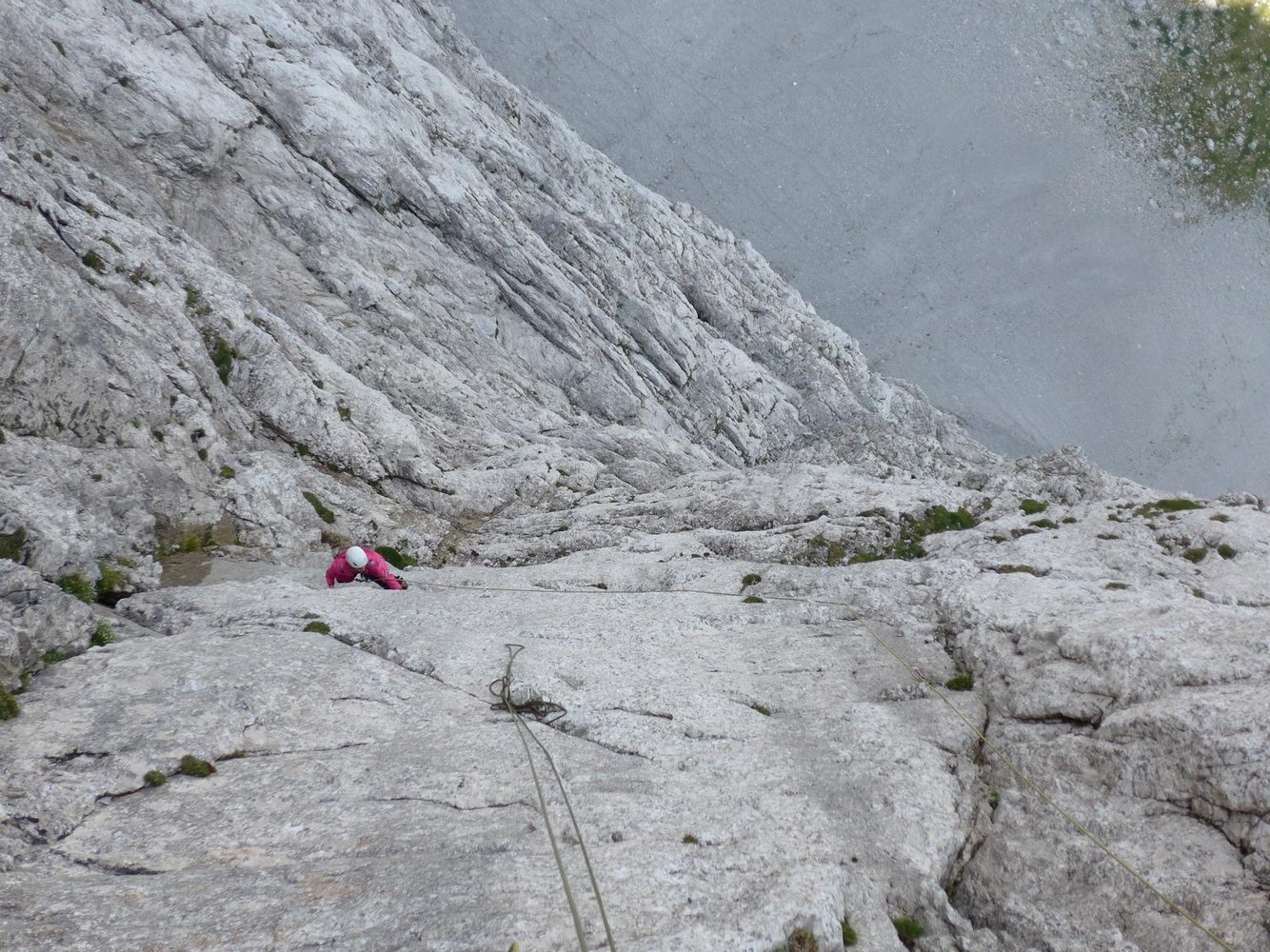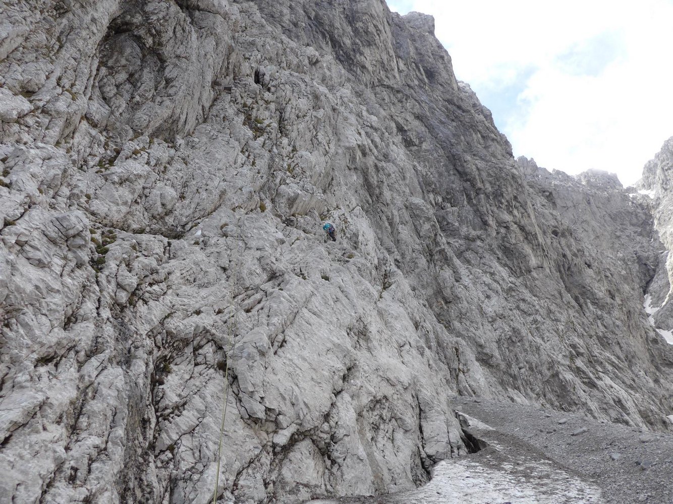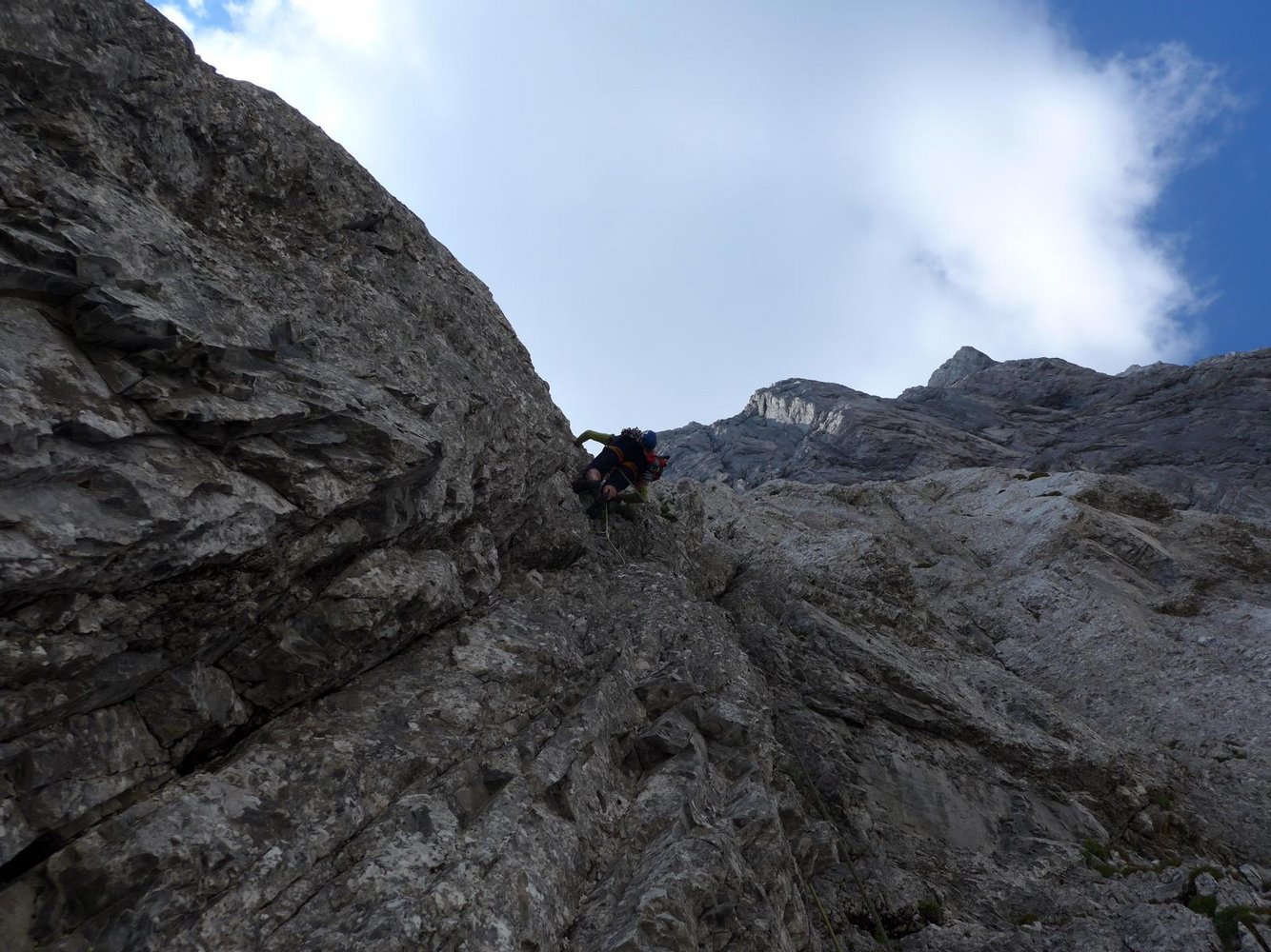 Auch wenn die Tour selbst 'nur' 9 Seillängen hat, sollte man den Gesamtanspruch dieser Unternehmung nicht unterschätzen: Langer Zustieg, anspruchsvoller Abstieg durch die Wasserfallschlucht, und eine Kletterei die Orientierung und Sicherheit im alpinen Gelände verlangt. Es empfiehlt sich trockene Verhältnisse und stabiles Wetter abzuwarten! Kletterzeit ca. 4-5h.