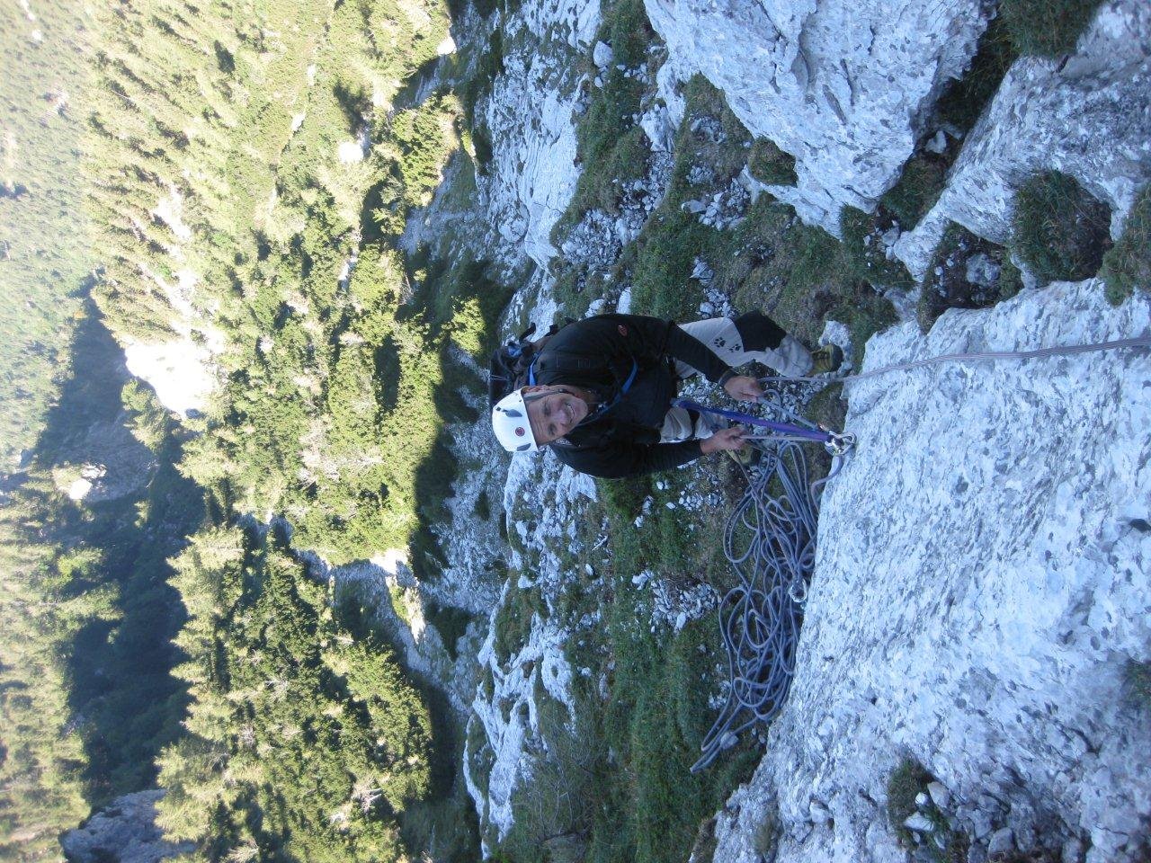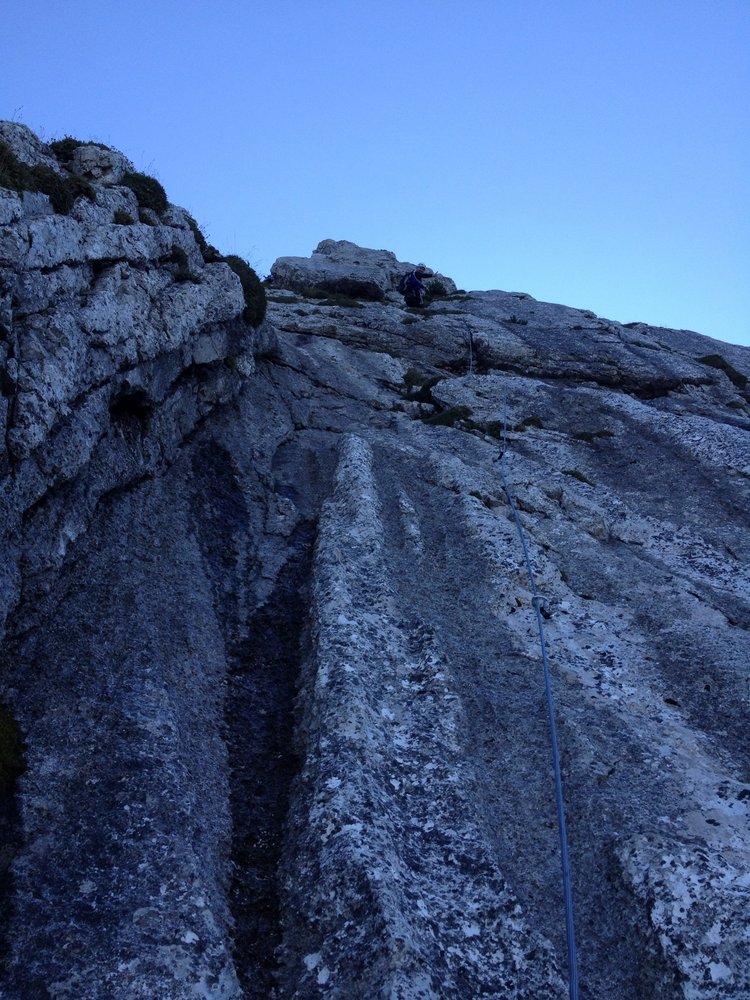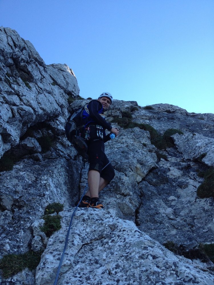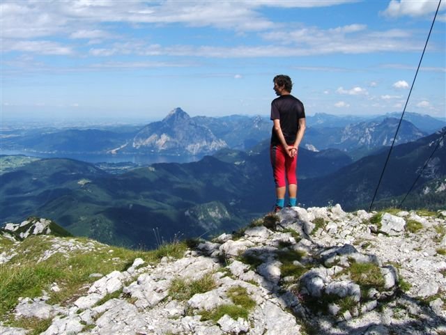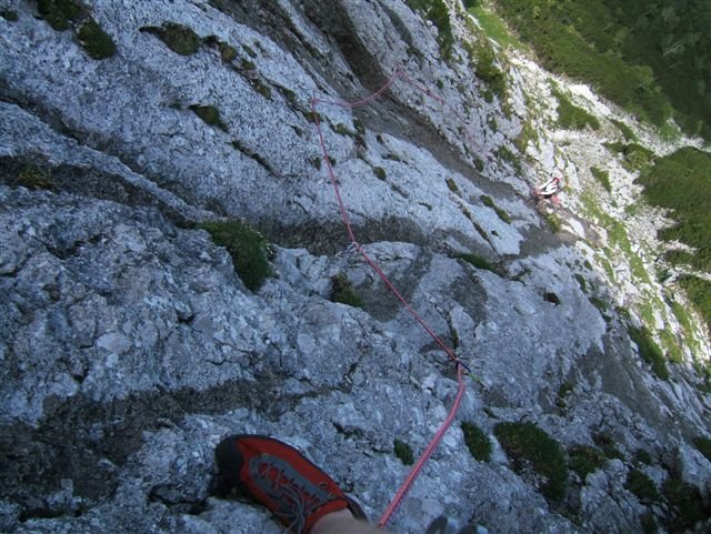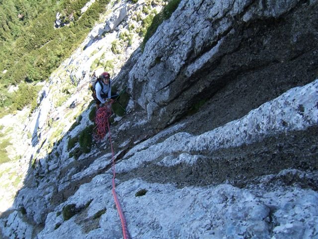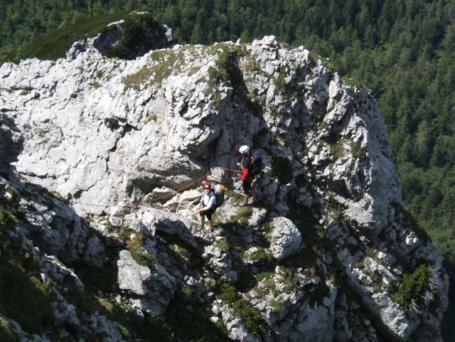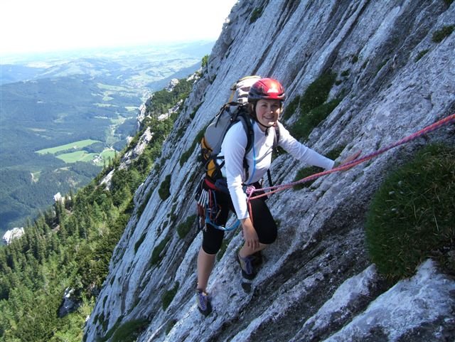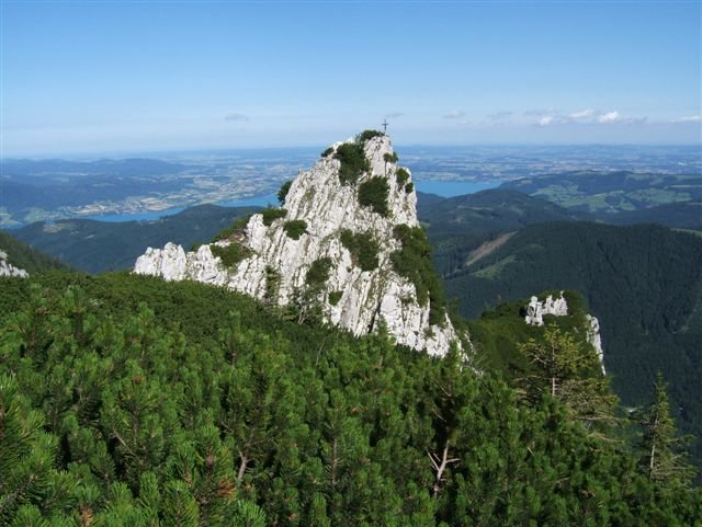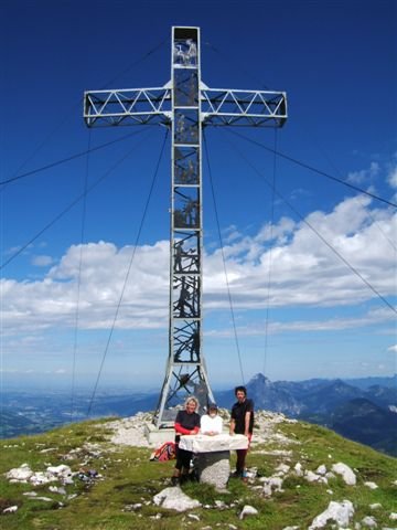 Vom letzten Bohrhaken über Gehgelände in Kürze zum Gipfel mit dem 14m (!) hohen Kreuz. Vom Gipfel über den markierten Normalweg und den Hochleckenkogel zur Taferlklause absteigen, oder über das Plateau zum Hochleckenhaus.