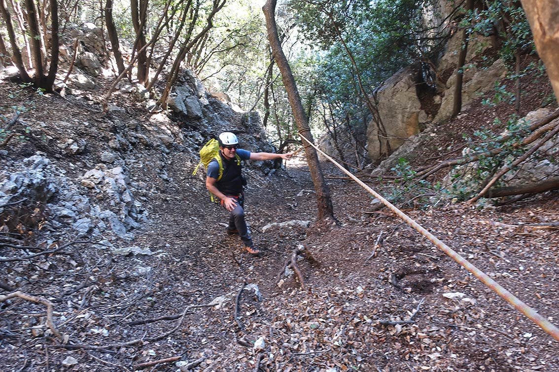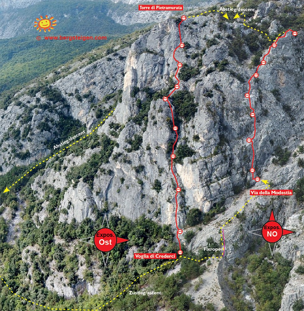 Vom Ausstieg ganz kurz dem Grat nach Westen folgen (Steinmänner), gleich vor dem zweiten Gratturm aber links (Süden) zu einem Fixseil hinunter. Entlang des Fixseils in eine steile, erdige Rinne und am rechten Rand der Rinne (Fixseile, rote Punkte) absteigen. Unten trifft man auf eine Schutthalde, dort auf Steigspuren (tlw. blaue Punkte) hinunter zum Aufstiegsweg.