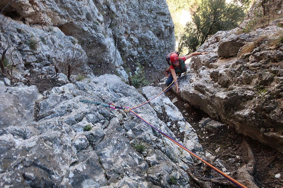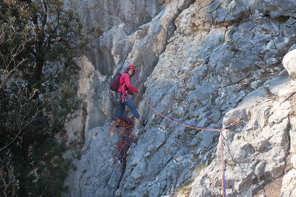 Recht gut mit Bohrhaken und wenigen Normalhaken und Sanduhrschlingen ausgestattet.