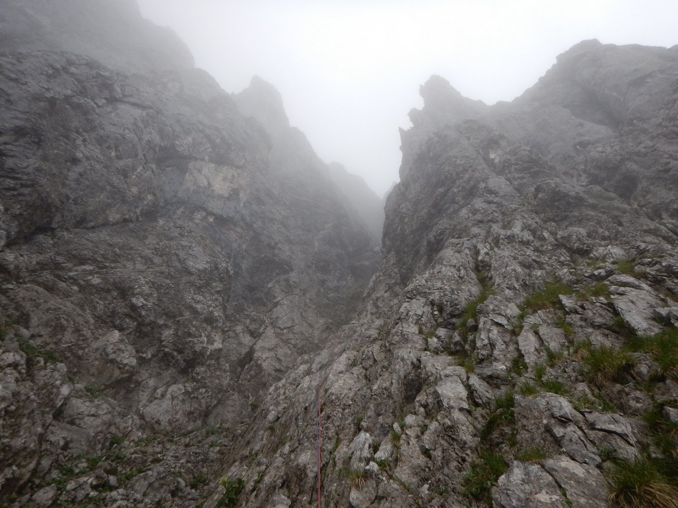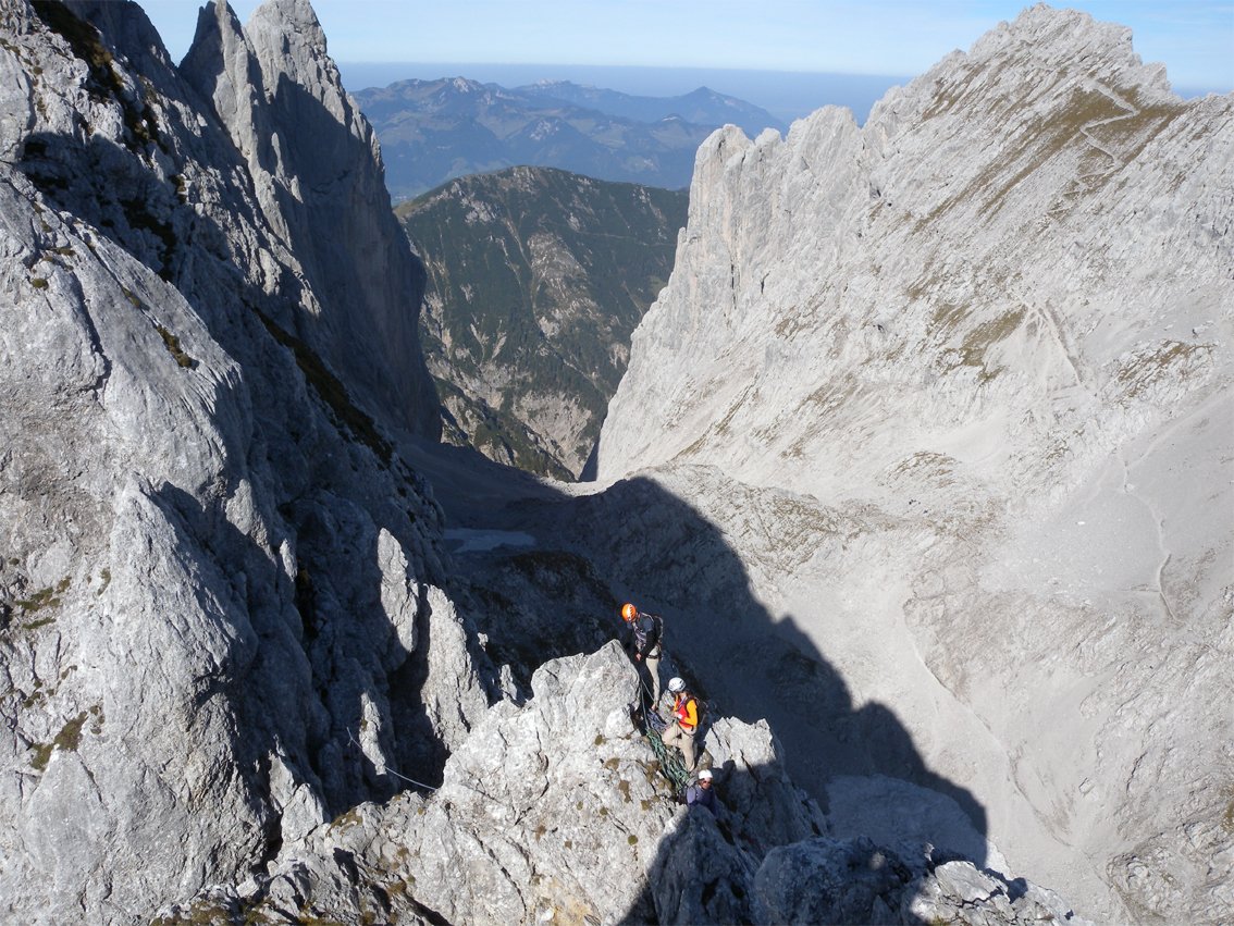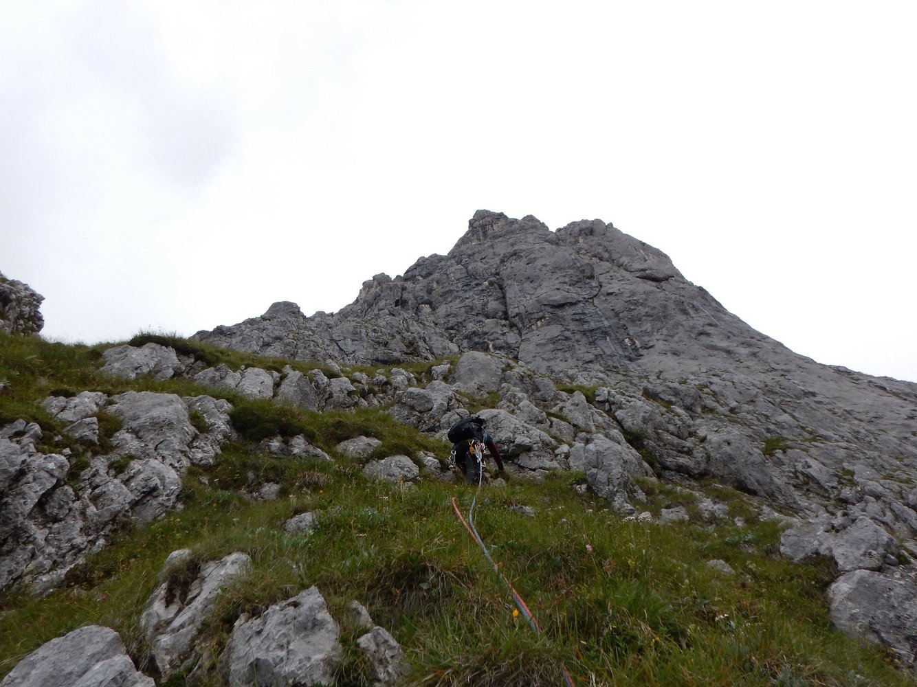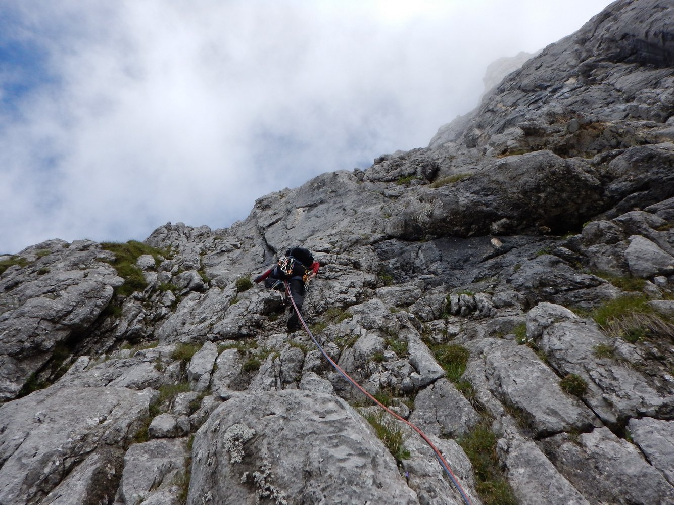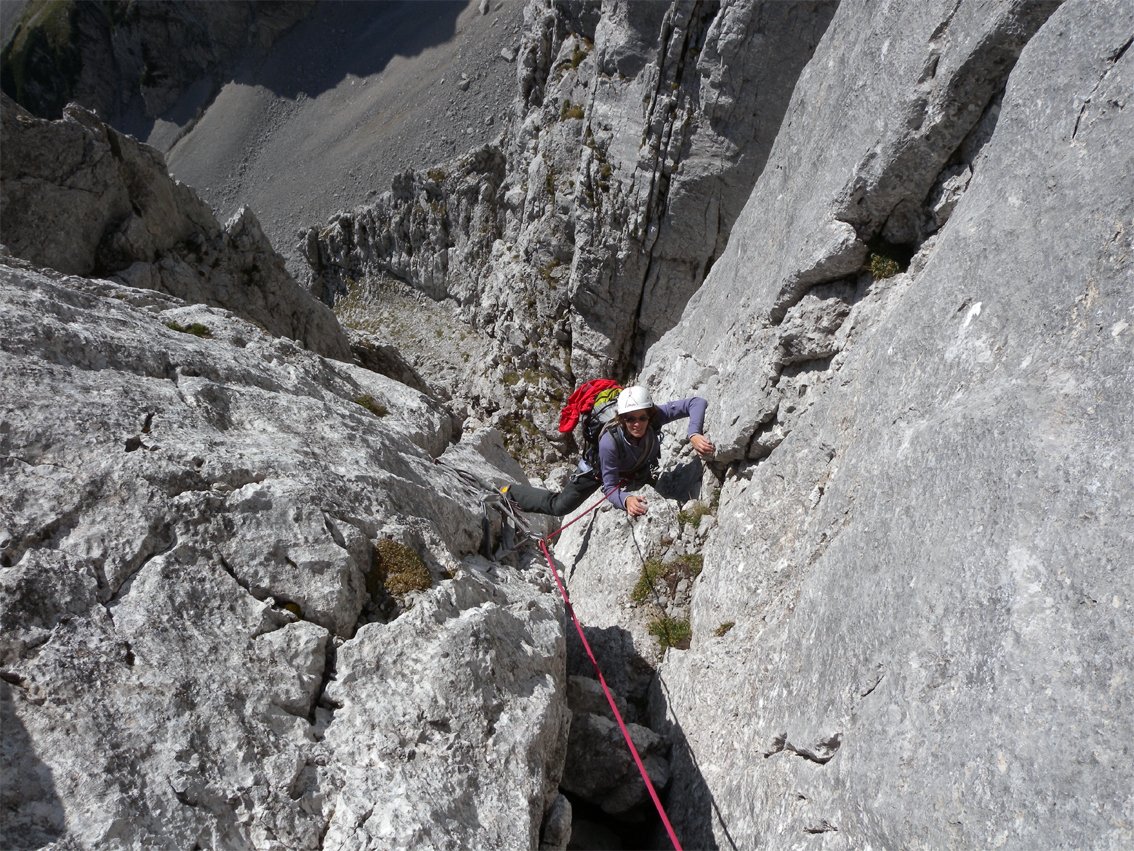 Denkt nicht nur an euere Sicherheit, sondern auch an die der anderen Alpinisten. Achtet vor allem vor und auf der leichten Rampe und auch im Mittelteil darauf, keine Steine loszutreten, wenn andere unter euch klettern. Den dritten Grad sollte man solide klettern können. Der Abstieg ist bei Nässe und Schnee heikel und erfordert nochmals vollste Aufmerksamkeit.