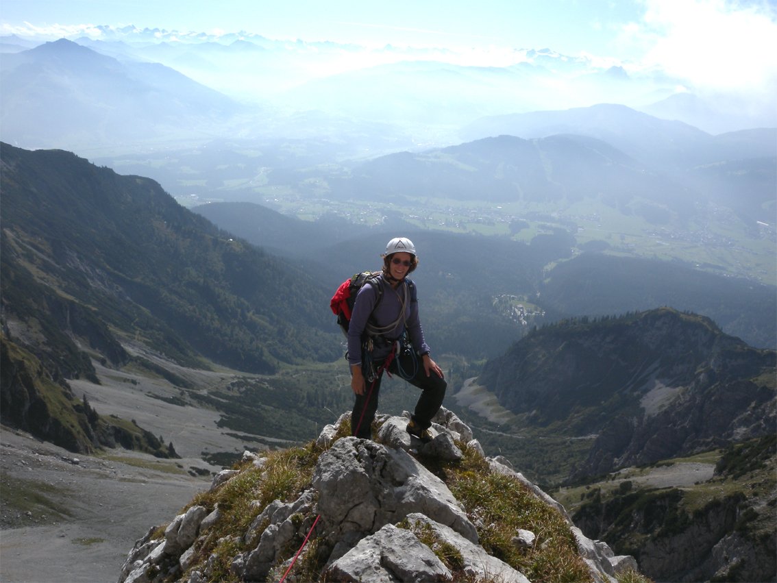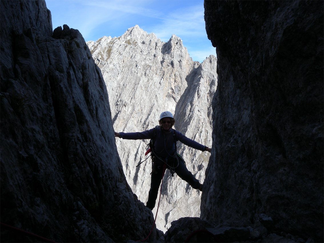 Schöner, leichter Klassiker über den Südostgrat auf den Gipfel der Vorderen Karlspitze. Die Vordere Karlspitze liegt links des berühmten Ellmauer Tors, einer mächtigen Einsattelung direkt auf dem Hauptkamm des Wilden Kaisers. Der lange Anstieg verläuft unten durch eine Wandzone auf eine große Rampe, an deren Ende die Rissverschneidung mit Durchschlupf (es geht aber auch außen, ist dann 4+) wartet. Danach folgt man dem Grat (eine Stelle 3+, mit 2 BH gesichert) bis zum Gipfel. Die Tour wurde von Herbert Haselsberger mit einigen Bohrhaken saniert, der alpine Charakter des Anstieges blieb aber erhalten. Die Wegfindung ist dank der recht gut sichtbaren Bohrhaken etwas einfacher geworden.