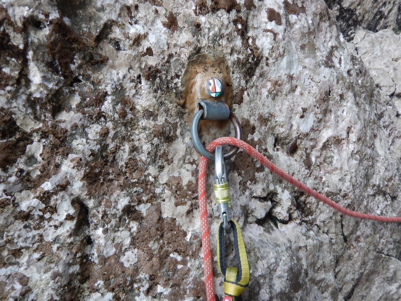 Einige wenige Bohrhaken (gesamt angeblich 21 Stück) stecken in der Route, man kann sich gut mit Köpferlschlingen helfen.
