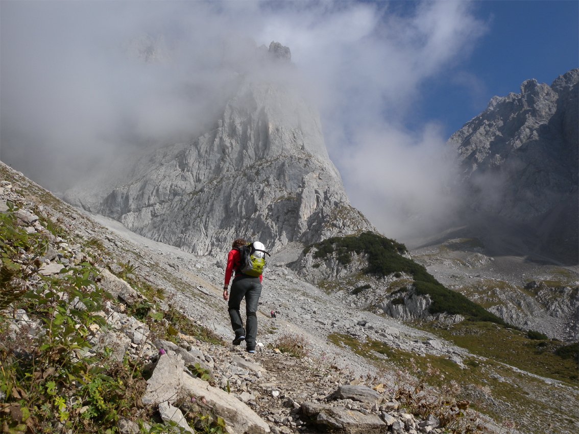Vom Gipfel auf dem Grat in Richtung Norden auf die Hintere Karlspitze zu, ca. 60 m nach der tiefsten Grateinsenkung, bei markantem blauem Pfeil rechts hinunter zum Ellmauer Tor. Man folgt immer der Markierung, Schrofengelände bis zum ersten Grad muss abgeklettert werden. Die Steilstufen sind teilweise auch mit Eisenklammern entschärft. Vom Ellmauer Tor auf dem markierten Weg zurück zur Wochenbrunneralm.
