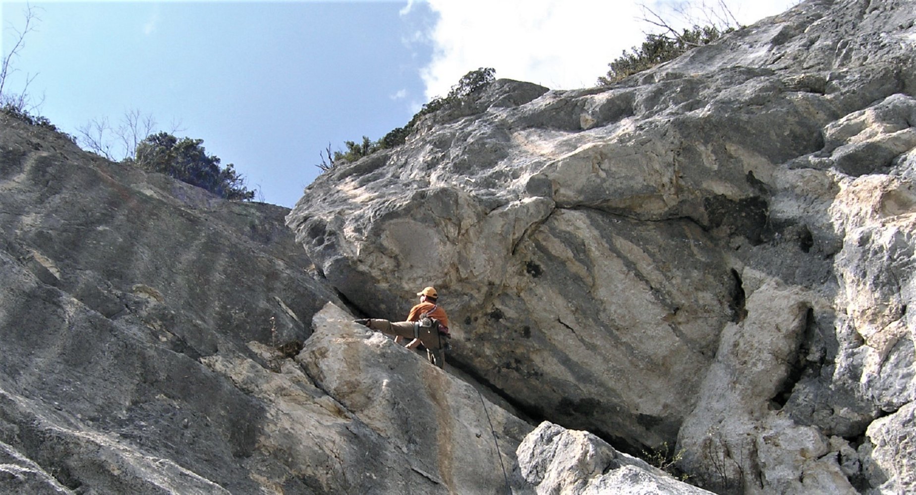 Großartiger Anstieg über einen Pfeiler bzw. Kamin und Platten. Wer die Schlüsselstelle geschafft hat, darf sich auf einen kurzen Stemmkamin freuen.