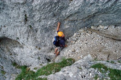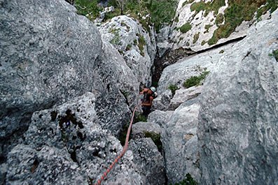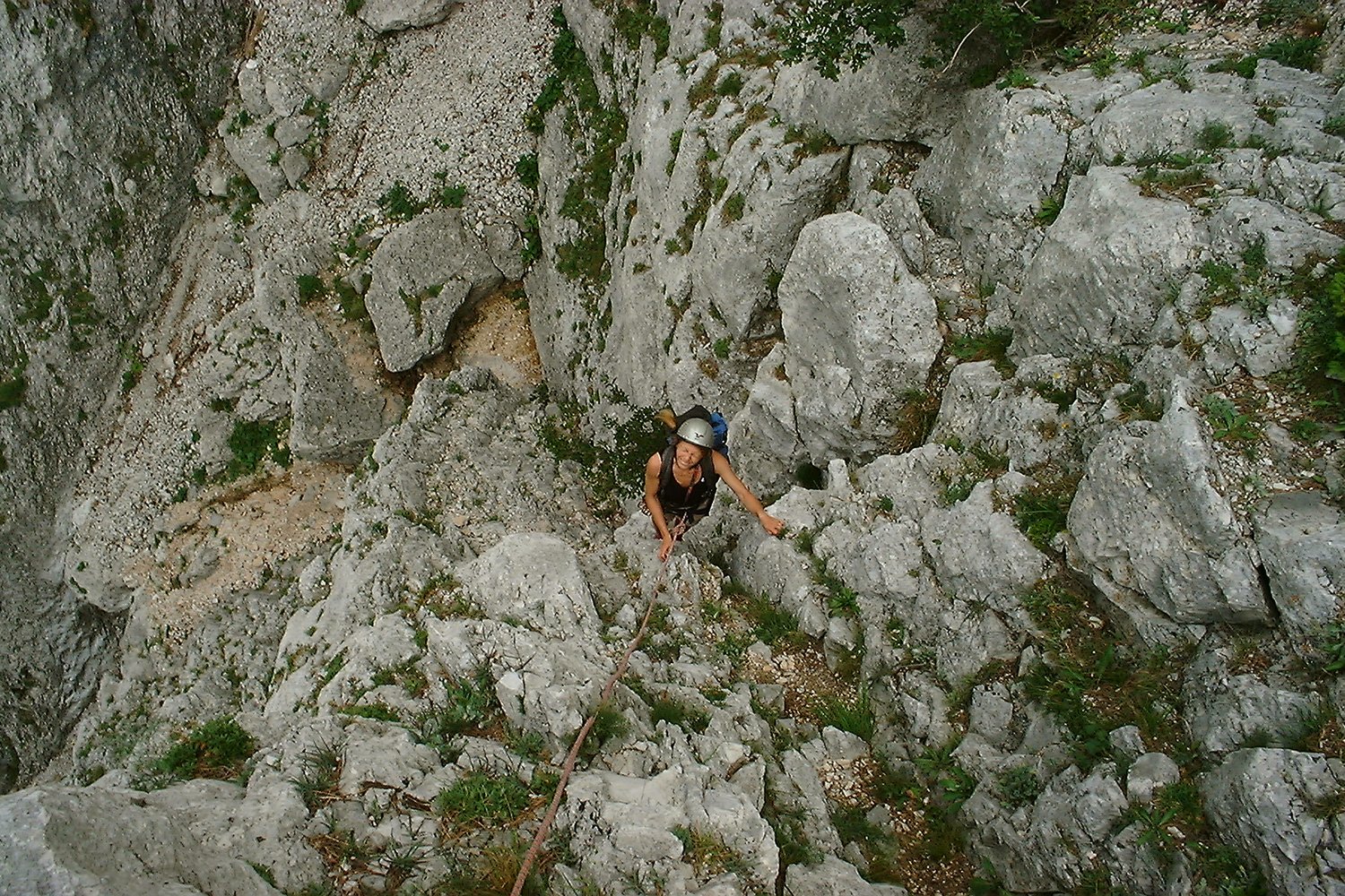 Beim Klemmblock extreme Steinschlaggefahr durch den Seilersten. D.h. davor den Stand rechts machen.