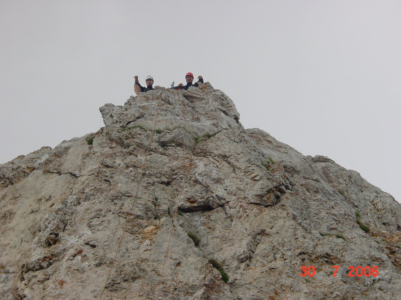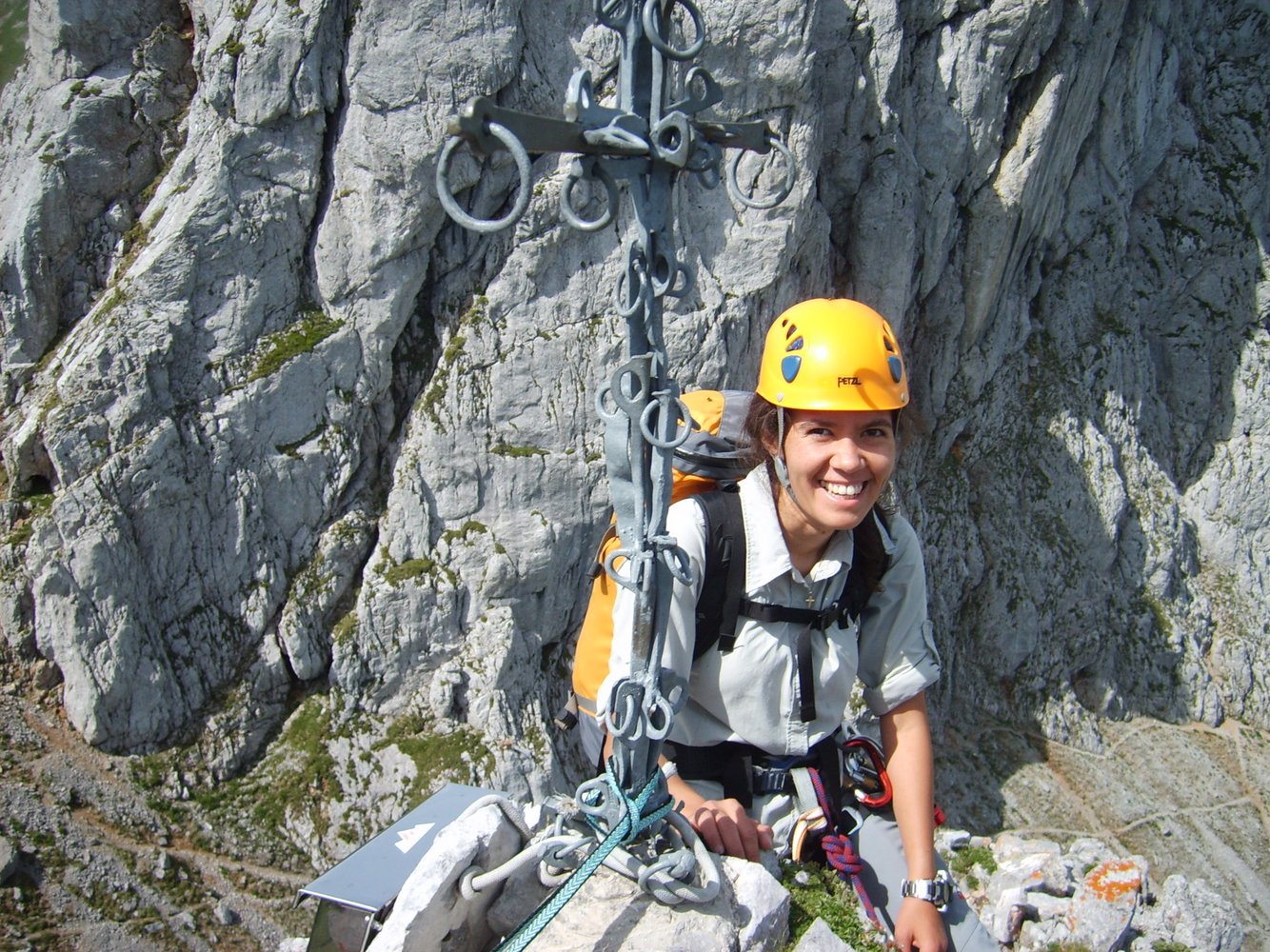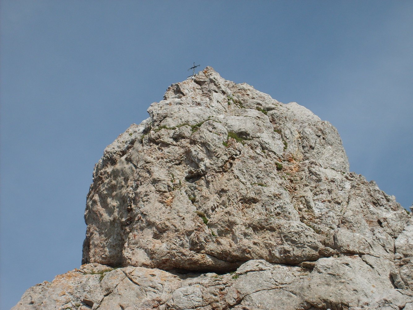 Vom luftigen Gipfel (originelles Gipfelkreuz, aus Haken geschmiedet !) über die letzte SL des Aufstiegs 15-20 m Abseilen (oder Abklettern) zur Scharte und dann dem dort ansetzenden Steig zurück zur Hütte folgen. In der kleinen Scharte am Wegbeginn könnte man auch südseitig zur Fölzalm absteigen (anfangs kurzes Fixseil).