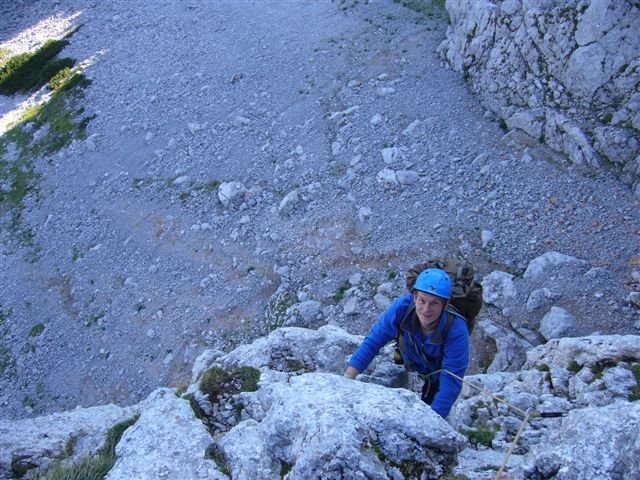 Tipp: Will man zum E zurück, dann nicht gleich das Schuttkar zum E absteigen (sehr loses Geröll, mühsam), sondern ein Stück am Steig weiter und dann rechts über einen Grasrücken absteigen (am Ende des Grasrückens gibt es eine 'Mini via ferrata').