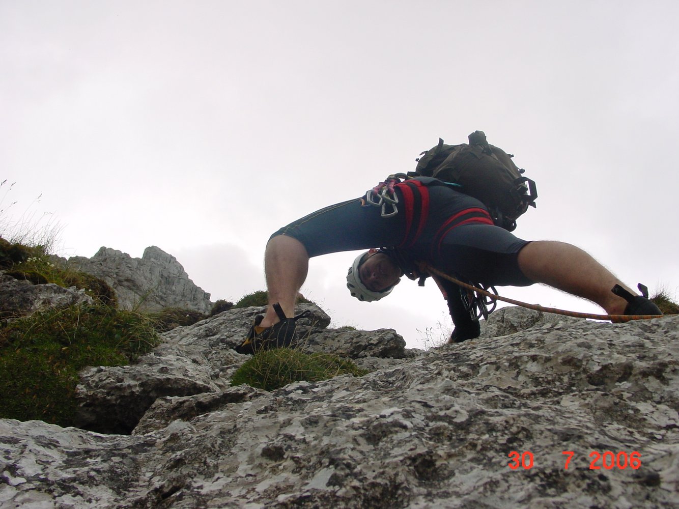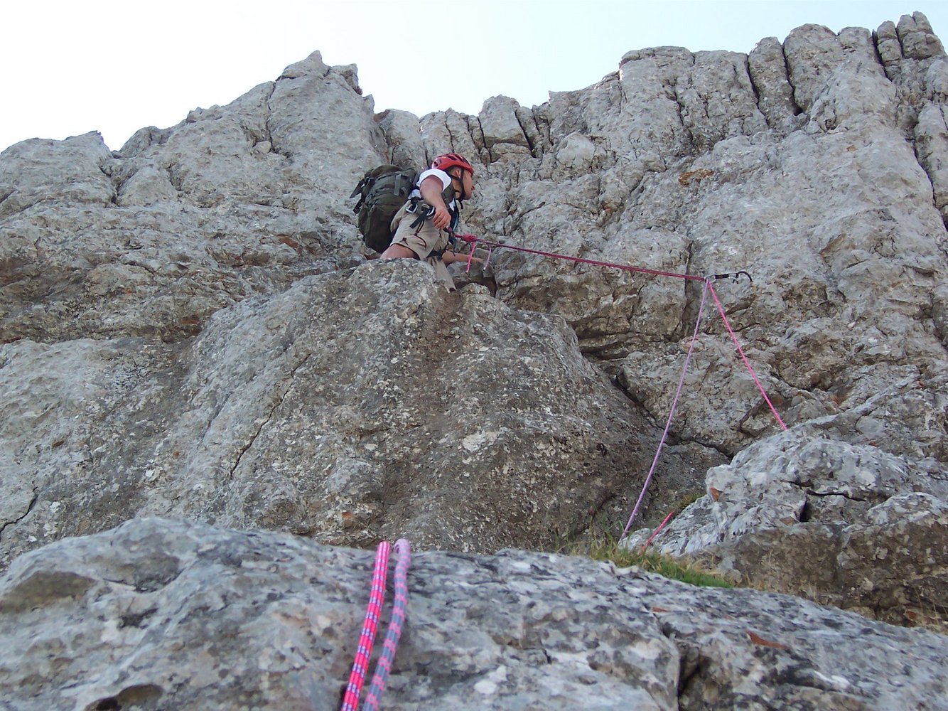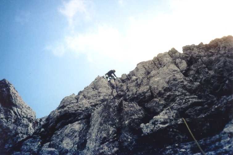 Der Einstieg ist von hier in 20-25 min zu erreichen. Er befindet sich links oberhalb des tiefsten Kantenpuntes (hier Rucksackdepot in Nische möglich) in einem düsteren Winkel am Beginn einer nach rechts aufwärtsziehenden Rampe (= 1. SL). Der direkte E über den Fußpunkt der Kante ist nicht saniert und schlecht abzusichern (ca . 5-).