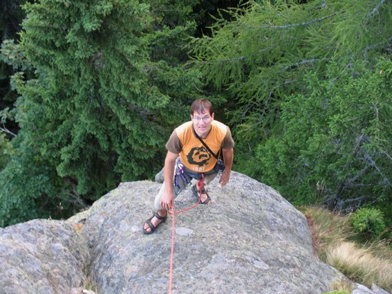 Gut mit BH geschichert, wobei zum Teil fragwürdiges Material der Bohrhaken vorgefunden. Sieht nach Selfmade-Laschen mit angerosteten Schnittkanten aus. (Infostand 06/2008)